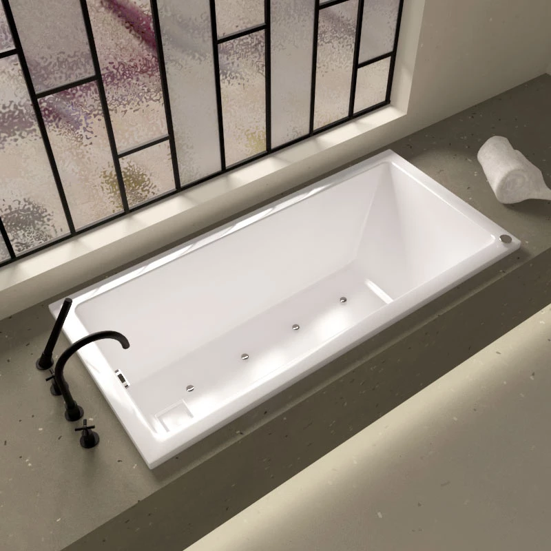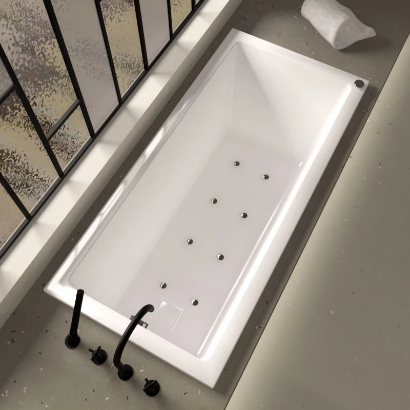 Baignoire balnéo Cavallo, 150 X 70 X 45 cm, en acrylique pour installation à encastrer. Equipée de l‘Air-System: 8 jets de massage au fond de la cuve. L’air passe à travers les buses et créé des bulles. Contrôle avec des boutons pneumatiques.