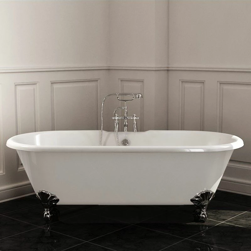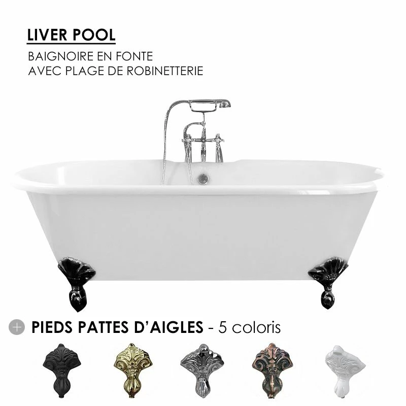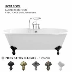 Baignoire en fonte émaillée. Épaisseur de l’émail 2 à 2,5 mm. Épaisseur de la fonte 6 à 8 mm. 5 couleurs de pieds en forme de pattes d’aigle au choix : chromé, blanc, noir, bronze ou doré. Vidage central. Plage de robinetterie avec percement 2 trous entraxe 180 mm. Découvrez notre configurateur 3D pour personnaliser cette baignoire.