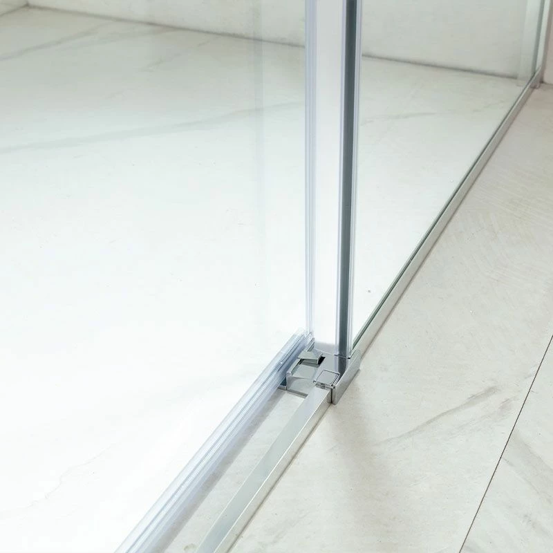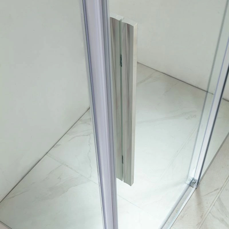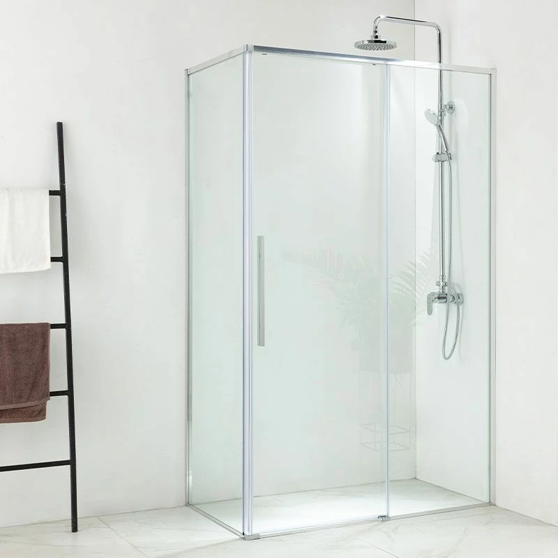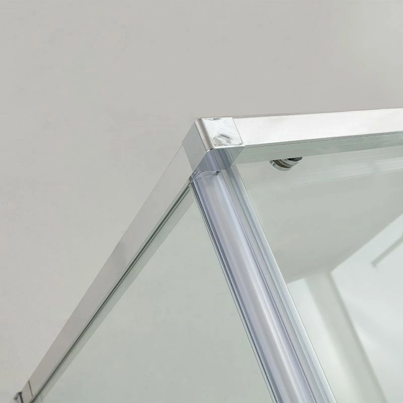 Cabine de douche d’angle avec profilés chromés, Arena. Cette cabine comprend deux parois fixes et une porte coulissante. Fabriqué en verre trempé Securit de 6mm. Poignée et profilés en aluminium. Modèle réversible gauche ou droite. Extensibilté de 0 à 10mm. Hauteur : 195cm.