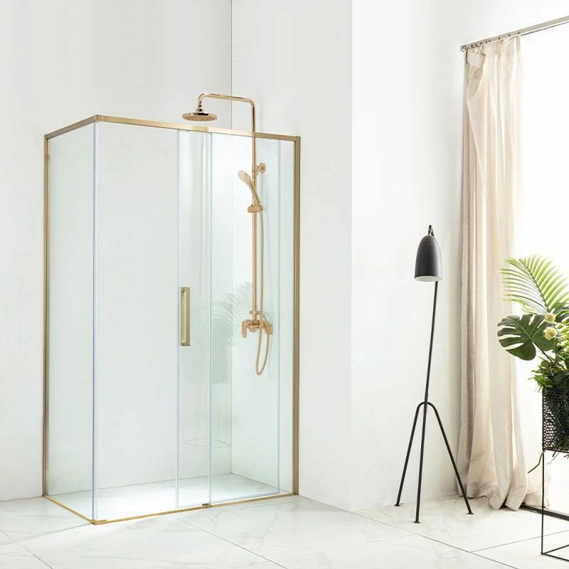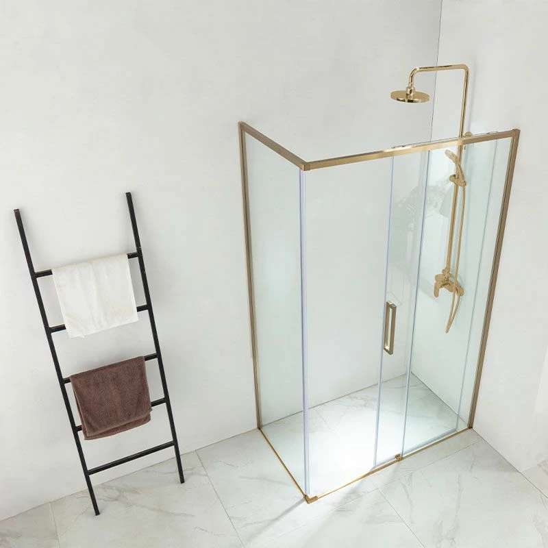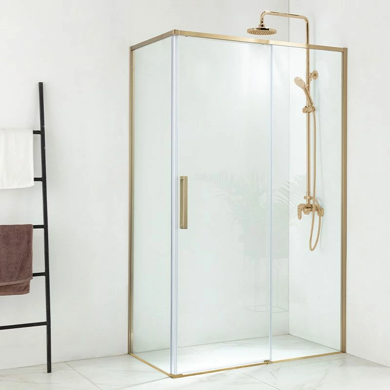 Cabine de douche d’angle avec profilés dorés brossés, Arena. Cette cabine est constituée d’une porte coulissante et de deux parois fixes. Fabriquée en verre trempé Securit de 6mm, sa poignée et ses profilés sont en aluminium. Modèle réversible gauche ou droite. Extensibilté de 0 à 10mm. Hauteur : 195cm.