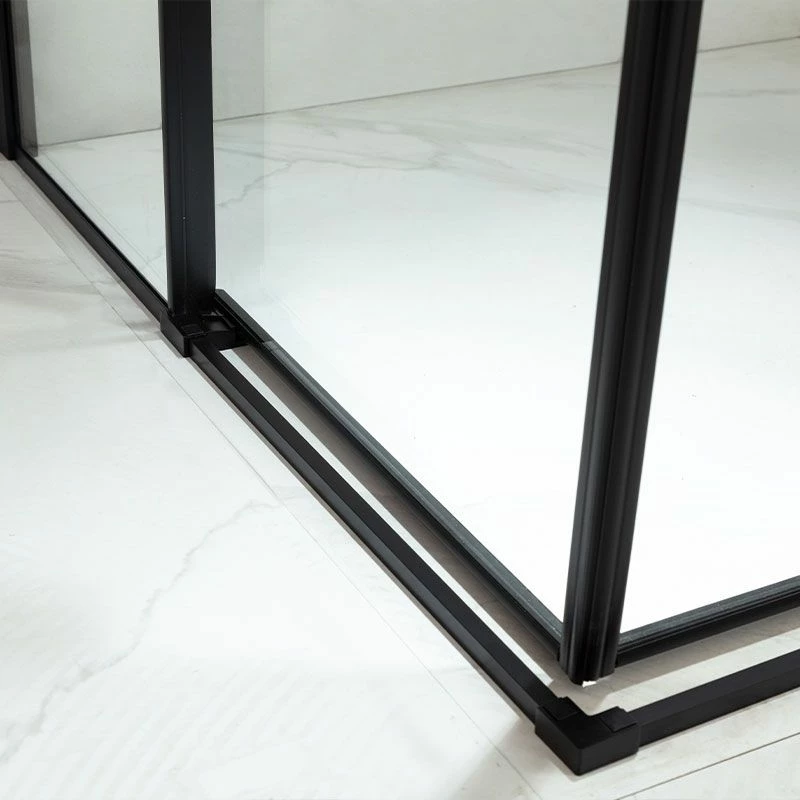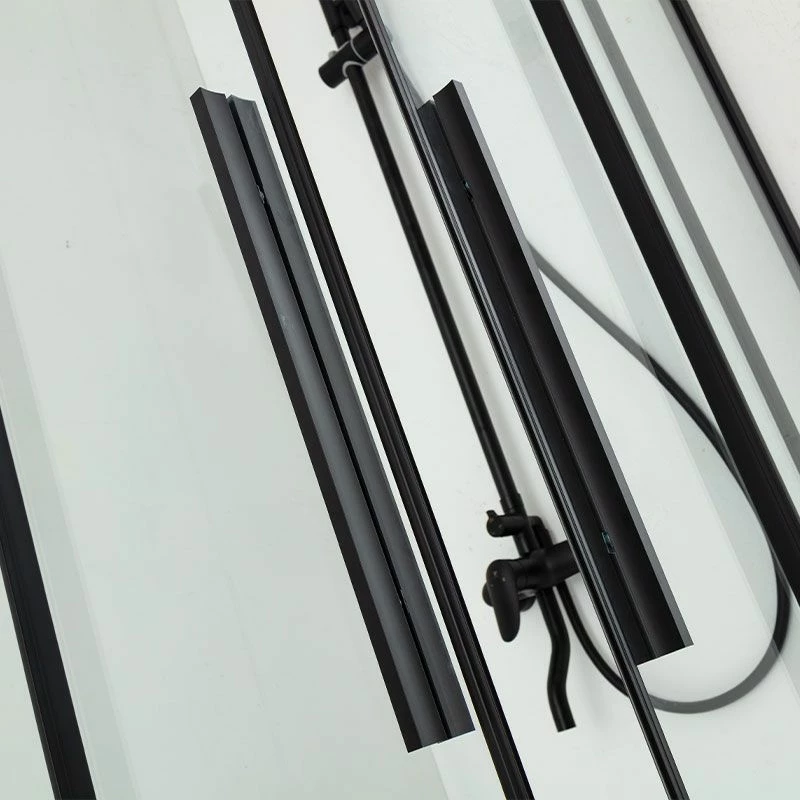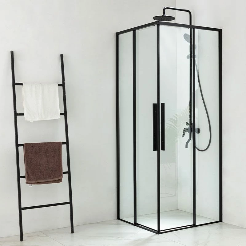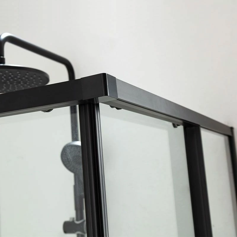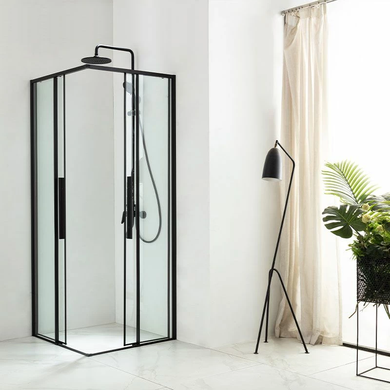 Cabine de douche coulissante d’angle avec profilés noirs, Arena Black. Cette cabine à ouverture centrale se compose de deux parois fixes et deux portes coulissantes. Elle est fabriquée en verre trempé Securit de 6mm. Poignées et profilés noirs mats. Modèle réversible gauche ou droite. Extensibilté de 0 à 20mm. Hauteur : 195cm.