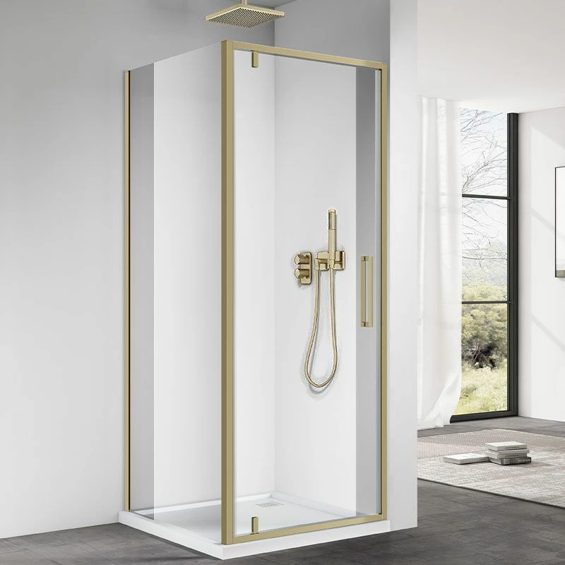 Cabine de douche d’angle avec profilés dorés brossés, Arena. Cette cabine est composée d’une porte pivotante et d’une paroi fixe. Fabrication en verre trempé Securit de 6mm. Poignée et profilés en aluminium. Modèle réversible gauche ou droite. Extensibilté de 0 à 10 mm. Hauteur : 195 cm.