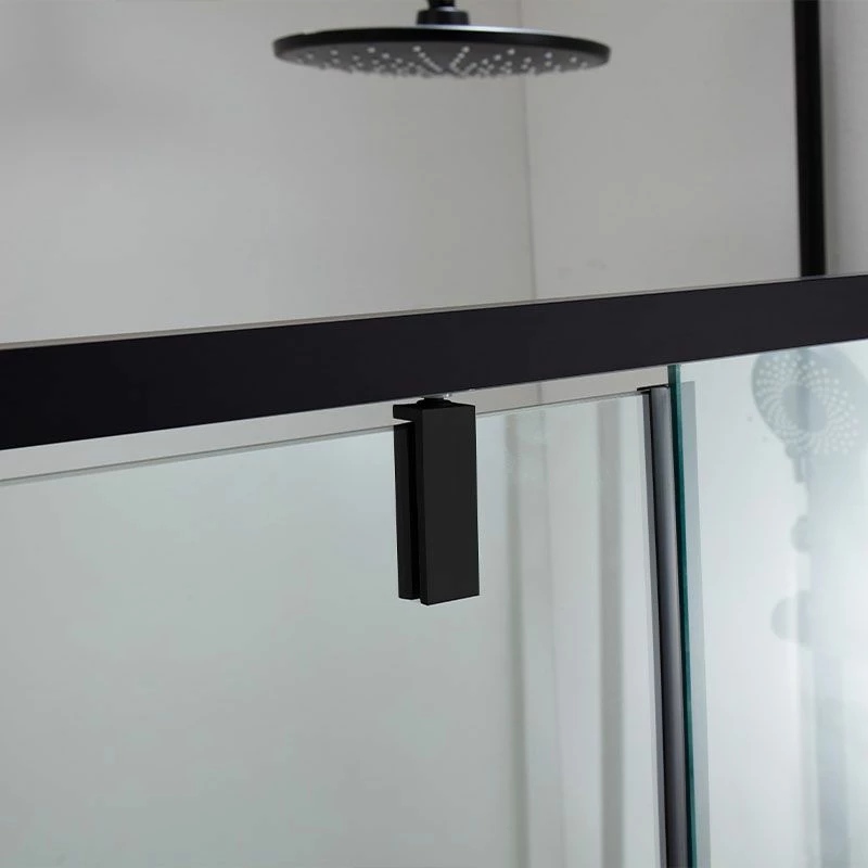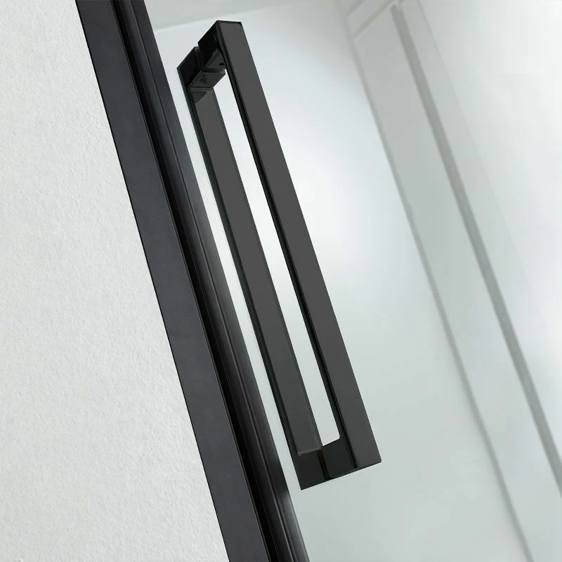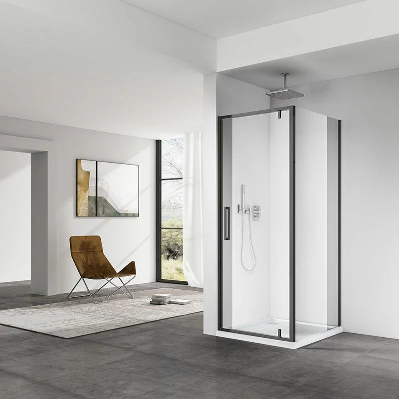 Cabine de douche d’angle avec profilés noirs mats, Arena. Cette cabine est composée d’une porte pivotante et d’une paroi fixe. Fabrication en verre trempé Securit de 6mm. Poignée et profilés en aluminium. Modèle réversible gauche ou droite. Extensibilté de 0 à 10 mm. Hauteur : 195 cm.