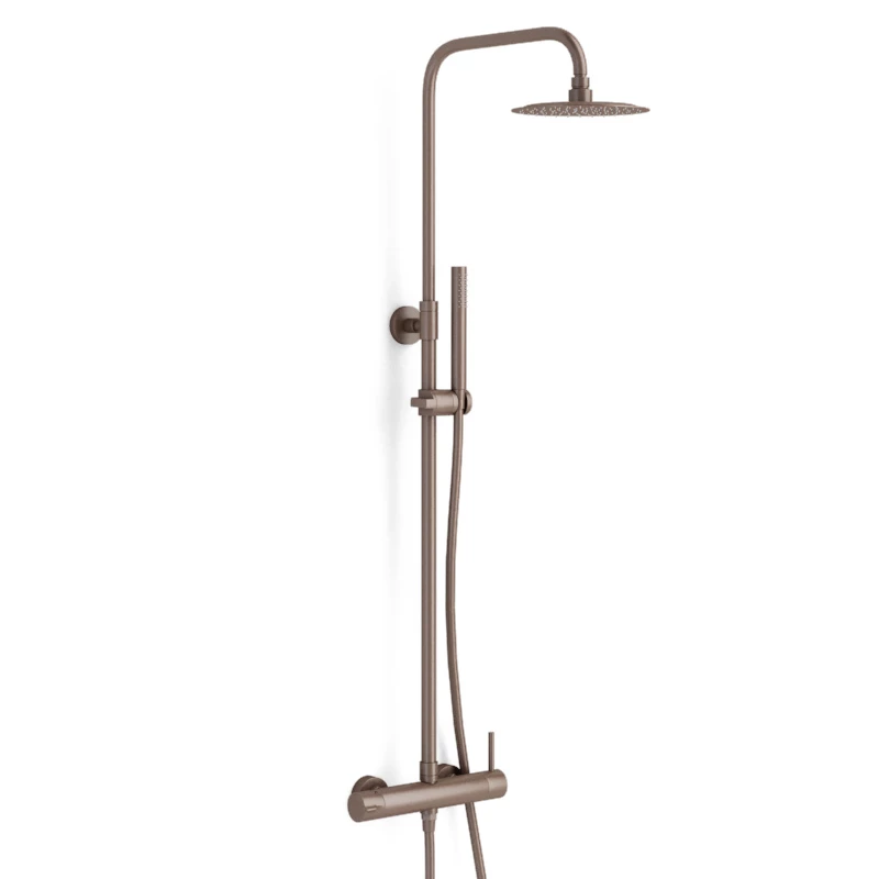 La colonne de douche mitigeur Châtelet en inox cuivré brossé allie finesse et lignes épurées. Ce robinet au design indémodable s’intègre dans une salle de bain moderne ou classique avec ses lignes courbes élégantes. La finition cuivre apporte par son effet brossé une touche de modernité supplémentaire à ce modèle de robinetterie. Composition complète, avec flexible PVC, douchette et pomme de tête. Garantie 5 ans.