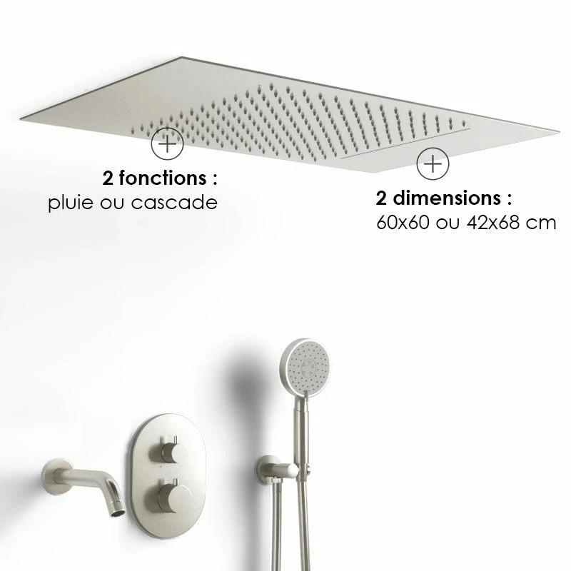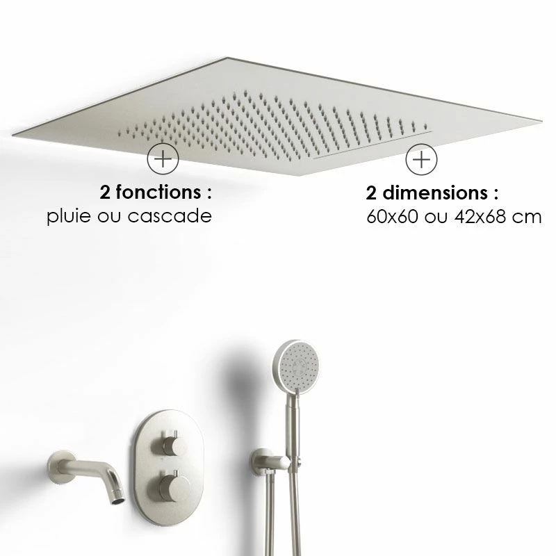 Ce ciel de pluie à encastrer au plafond est réalisé en acier inoxydable finition inox brossé. Il est équipé de 2 modes de jets différents : Pluie et Cascade, pour profiter d’un moment de détente sous la douche. Disponible en 2 dimensions : 60 x 60 cm ou 42 x 68 cm.