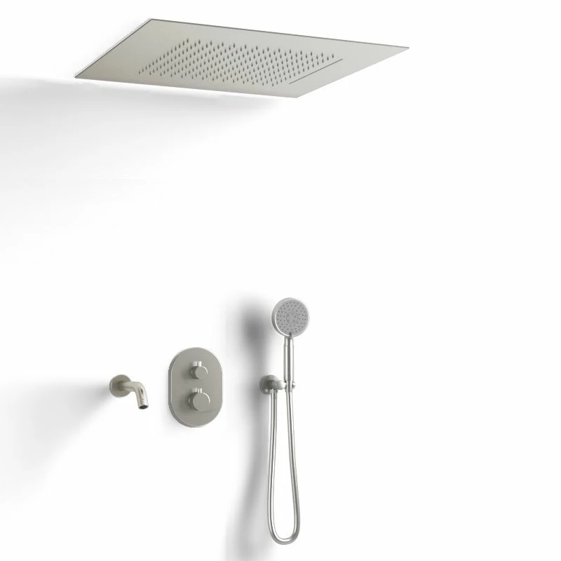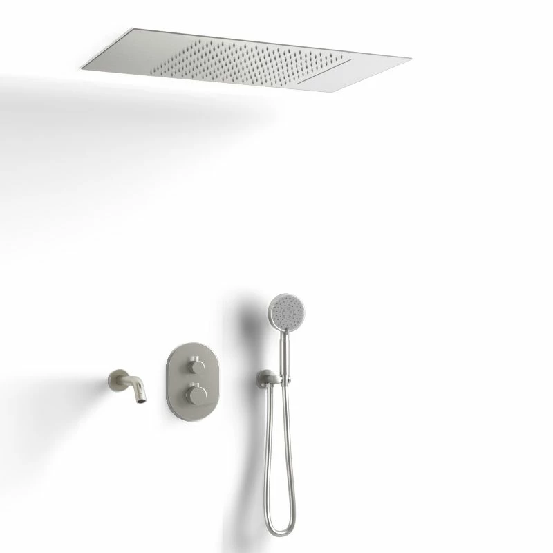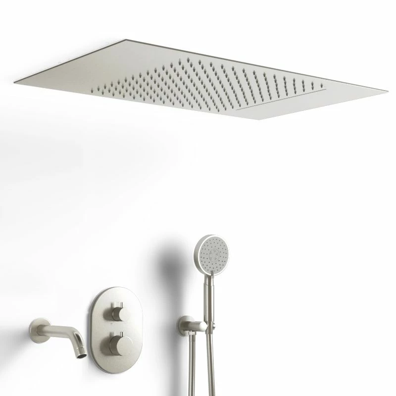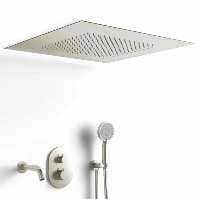 Composition de douche thermostatique encastrée Châtelet en inox brossé. Ce robinet au design indémodable se caractérise par son grand ciel de pluie (2 dimensions disponibles) à encastrer au plafond avec fonctions pluie et cascade. La finition inox brossé apporte par son aspect mat une touche de modernité à ce modèle de robinetterie. Composition : Mitigeur thermostatique, bec de bain, flexible 150 cm, douchette à main avec sélecteur, support avec prise d’eau et ciel de pluie encastré.