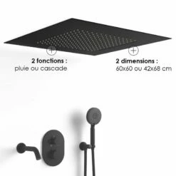 Ce ciel de pluie à encastrer au plafond est réalisé en acier inoxydable finition noir mat. Il est équipé de 2 modes de jets différents : Pluie et Cascade, pour profiter d’un moment de détente sous la douche. Disponible en 2 dimensions : 60 x 60 cm ou 42 x 68 cm.