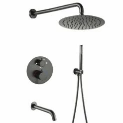 La composition encastrée bain douche thermostatique, Châtelet en acier inoxydable gris anthracite allie finesse et lignes épurées. Grâce à son design moderne, elle s’intègre dans une salle de bain de style indus ou contemporain. La finition gris anthracite apporte par son aspect brillant une touche de modernité supplémentaire à ce modèle de robinetterie. Composition : flexible PVC, douchette et support, douche de tête et bec de bain. Garantie 5 ans.