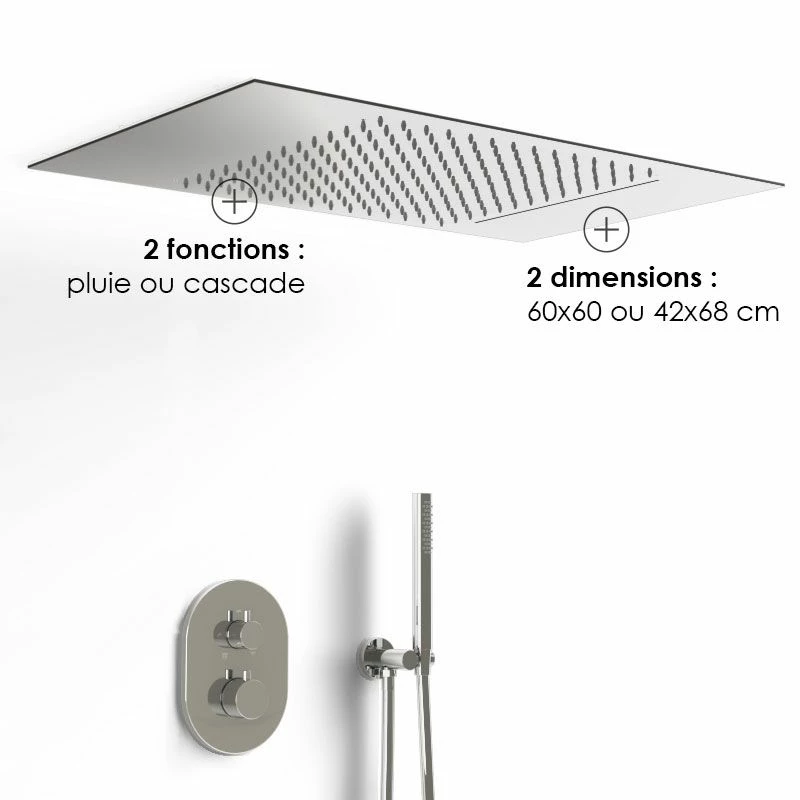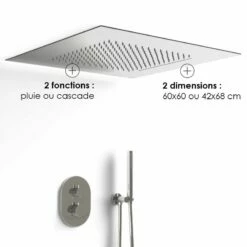 Ce ciel de pluie à encastrer au plafond est réalisé en acier inoxydable finition chromé. Il est équipé de 2 modes de jets différents : Pluie et Cascade, pour profiter d’un moment de détente sous la douche. Disponible en 2 dimensions : 60 x 60 cm ou 42 x 68 cm.