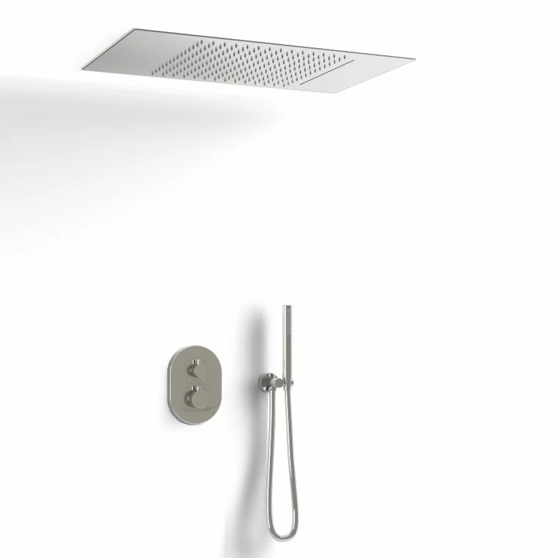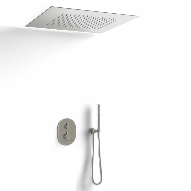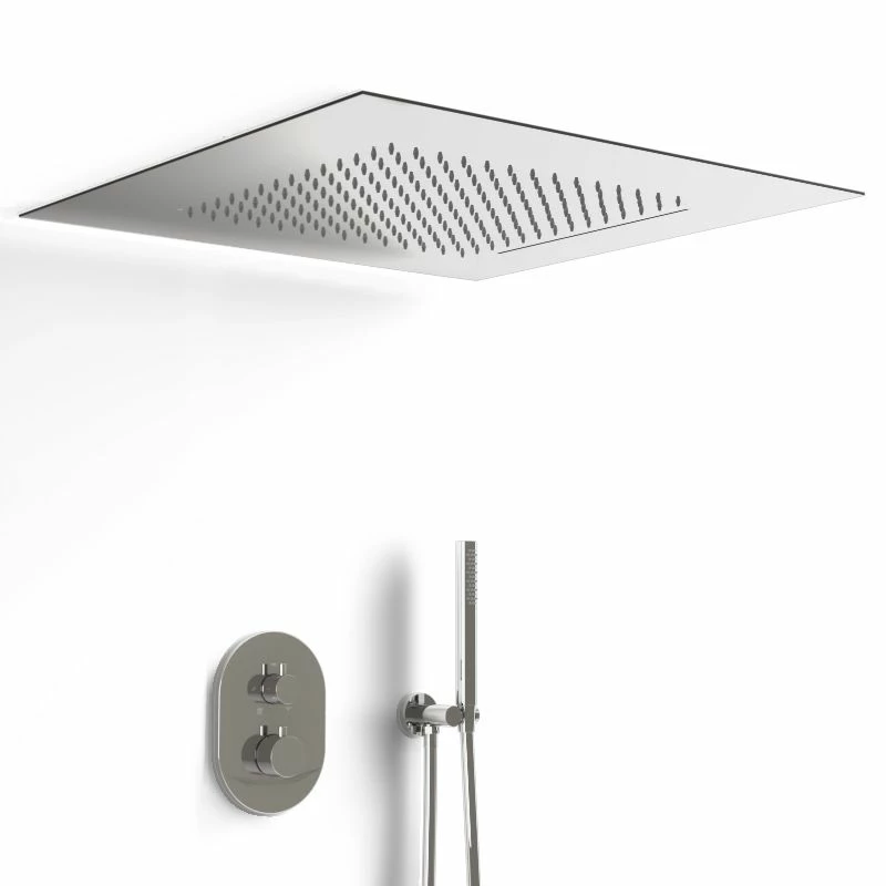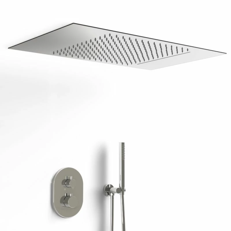 Composition de douche thermostatique encastrée Châtelet en inox chromé. Ce robinet au design indémodable se caractérise par son grand ciel de pluie (2 dimensions disponibles) à encastrer au plafond, avec fonctions pluie et cascade. La finition chrome apporte par sa brillance une touche de raffinement supplémentaire à ce modèle de robinetterie. Composition: Mitigeur thermostatique, flexible 150 cm, douchette tube, support avec prise d’eau et ciel de pluie encastré. Garantie 5 ans.