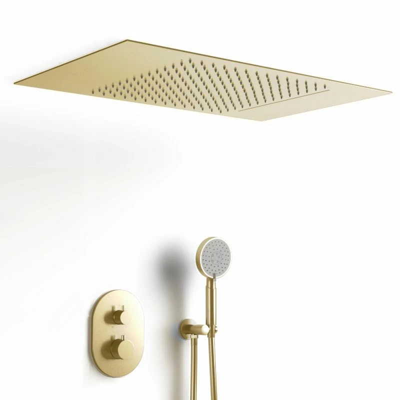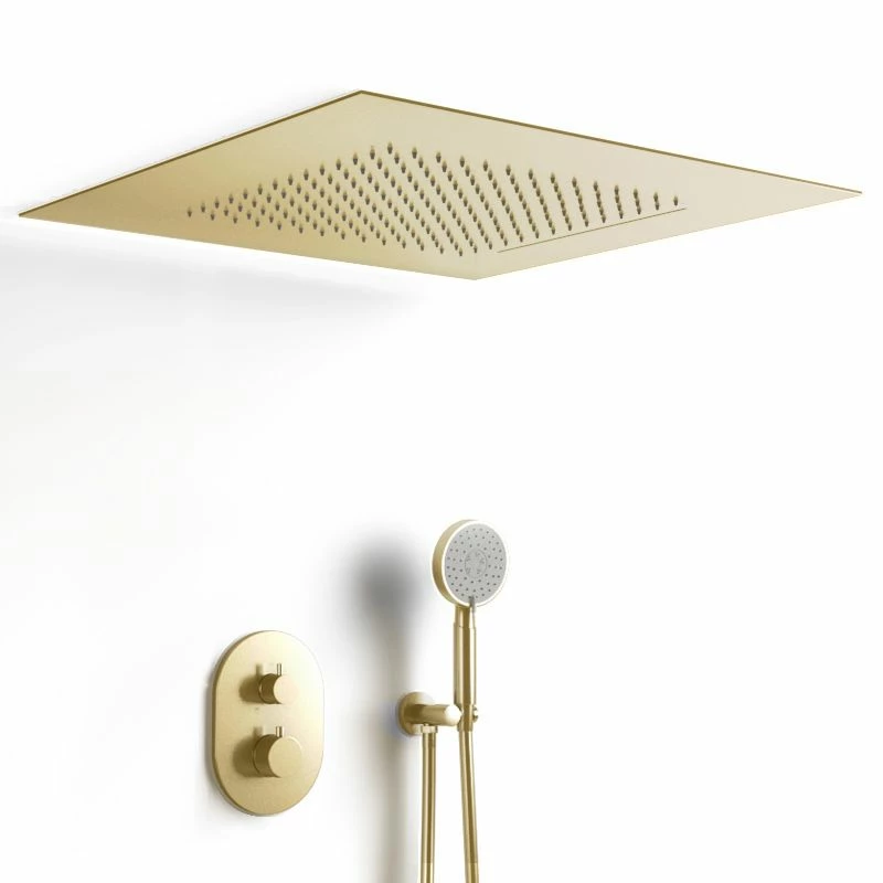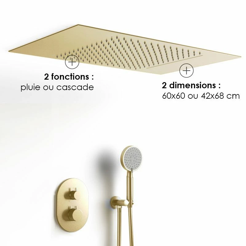Composition de douche thermostatique encastrée Châtelet en inox doré brossé. Ce robinet au design indémodable se caractérise par son grand ciel de pluie (2 dimensions disponibles) à encastrer au plafond avec fonctions pluie et cascade. La finition dorée apporte par son aspect mat une touche de modernité à ce modèle de robinetterie. Composition: Mitigeur thermostatique, flexible 150 cm, douchette à main avec sélecteur, support avec prise d’eau et ciel de pluie encastré. Garantie 5 ans.