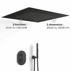 Ce ciel de pluie à encastrer au plafond est réalisé en acier inoxydable finition noir mat. Il est équipé de 2 modes de jets différents : Pluie et Cascade, pour profiter d’un moment de détente sous la douche. Disponible en 2 dimensions : 60 x 60 cm ou 42 x 68 cm.