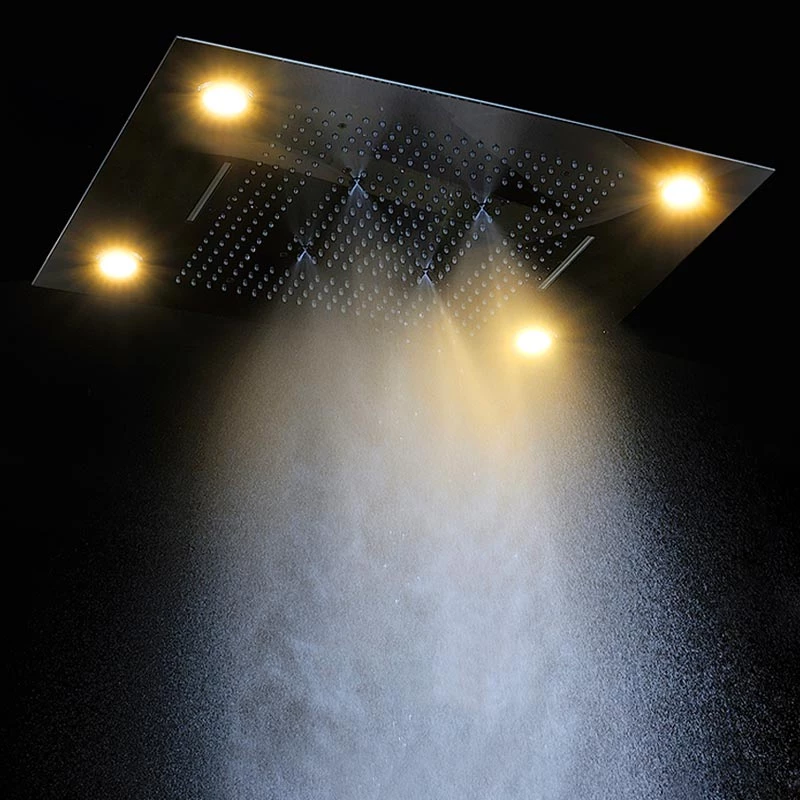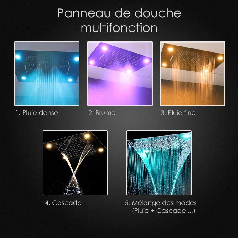 Ciel de pluie encastré au plafond de 60×80 cm, 5 modes de jets différents + chromothérapie. Sa fonction pluie dense ou fine vous permettra de vous relaxer et de bénéficier d’un léger massage grâce aux nombreuses micro-buses qui reproduisent la douce sensation d’un orage d’été sur votre peau. Le jet cascade est idéal pour vos cervicales et vous permettra de bénéficier de moments de relaxation uniques et d’un véritable bienfait. La chromothérapie, ou cure des couleurs vous relaxera grâce à son influence psychique et physique. Il existe plusieurs couleurs, que vous pouvez contrôler depuis la télécommande d’éclairage. Ne nécessitant qu’un léger entretien et très esthétique, votre douche deviendra un véritable espace détente.