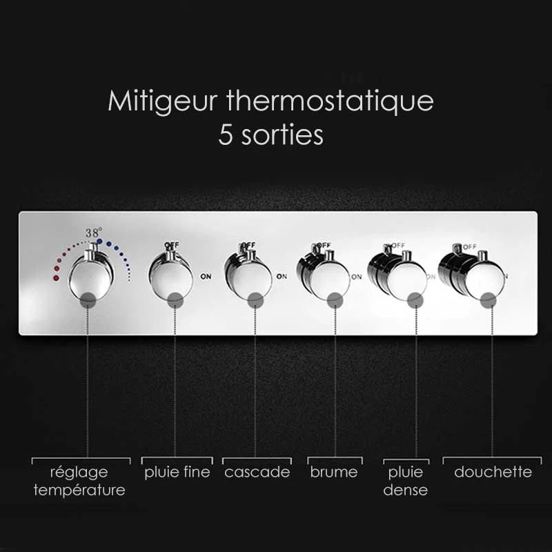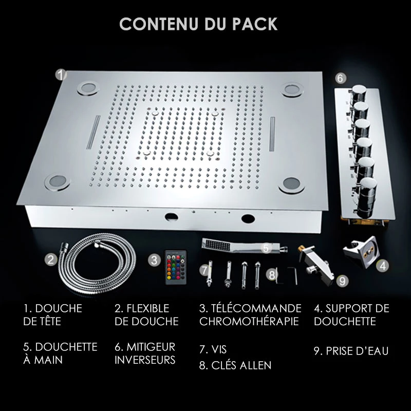 Pack douche thermostatique 5 sorties avec chromothérapie, Colours. Ce pack de douche comprend : un ciel de pluie encastré 80×60 cm, un mitigeur thermostatique avec 5 inverseurs, un set de douche chromé complet avec douchette, support, prise d’eau et flexible d’1,50 m. Ciel de pluie avec chromothérapie LED contrôlé par une télécommande (incluse). 4 fonctions de jets à utiliser séparément ou simultanément pour encore plus de confort (Pluie fine, Cascade, Brume, Pluie dense)