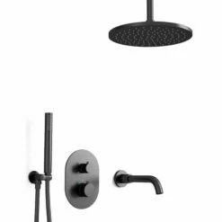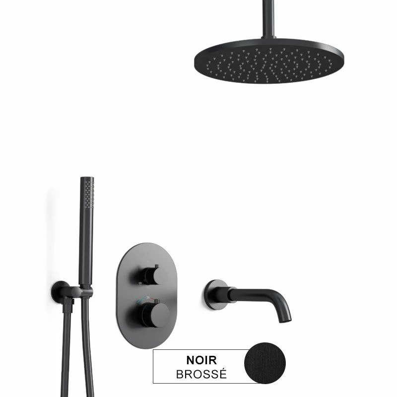 La composition bain-douche thermostatique encastrée Châtelet en acier inoxydable allie finesse et lignes épurées. Ce robinet au design indémodable s’intègre dans une salle de bain contemporaine ou classique avec ses lignes courbes élégantes. La finition noire apporte par son côté brossé une touche de raffinement supplémentaire à ce modèle de robinetterie. Composition complète, avec flexible PVC, douchette, pomme de tête et bras plafond. Garantie 5 ans.