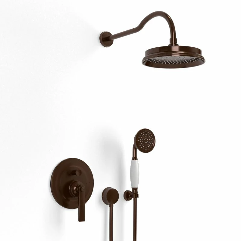 Cette composition de douche Liberty cuivrée se caractérise par son design rétro des années 30. Elle est composée d’un robinet de douche mitigeur 2 sorties, d’une douche de tête 22,5 cm de diamètre, et d’une douchette à main avec son flexible PVC 150 cm, sa prise d’eau murale et son crochet. Corps d’encastrement inclus avec une cartouche céramique Kerox.