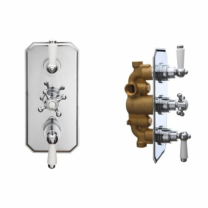 Robinet thermostatique Diana en laiton chromé pour installation à encastrer. 2 sorties. Corps d’encastrement inclus.