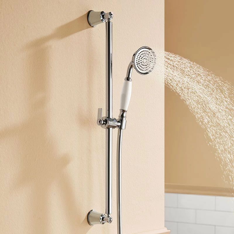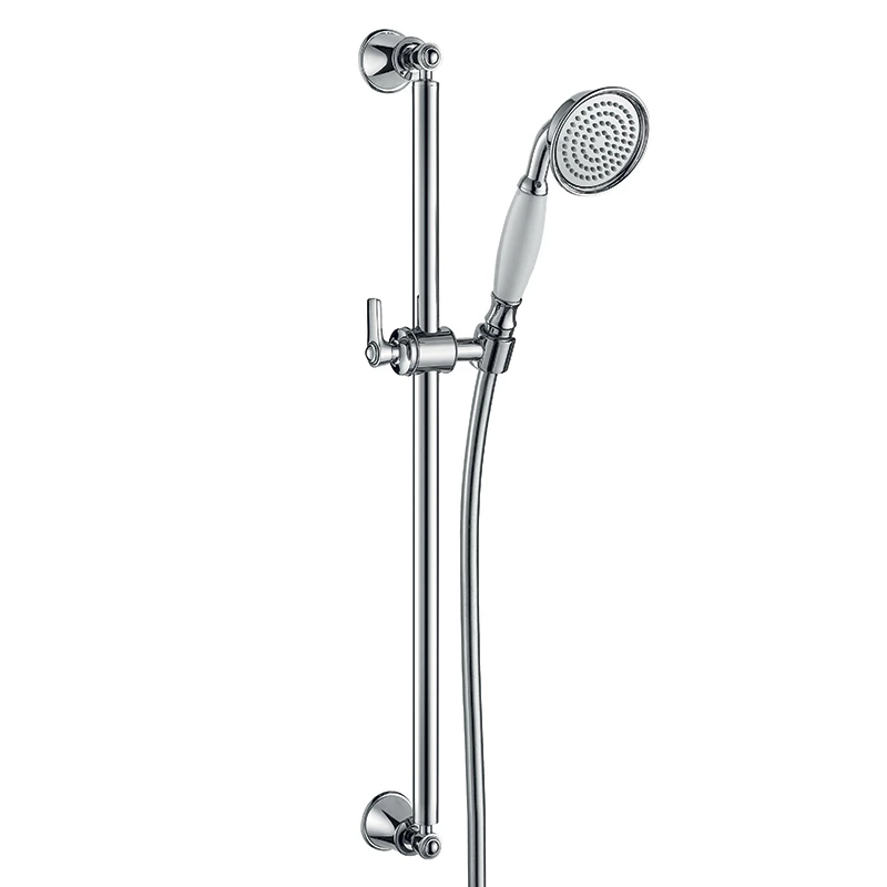 Set de douche à Liberty en laiton et finition chromée comprenant une douchette, une barre avec support de douchette mural et un flexible PVC de 150 cm. Ensemble rétro avec poignée de la douchette en porcelaine.