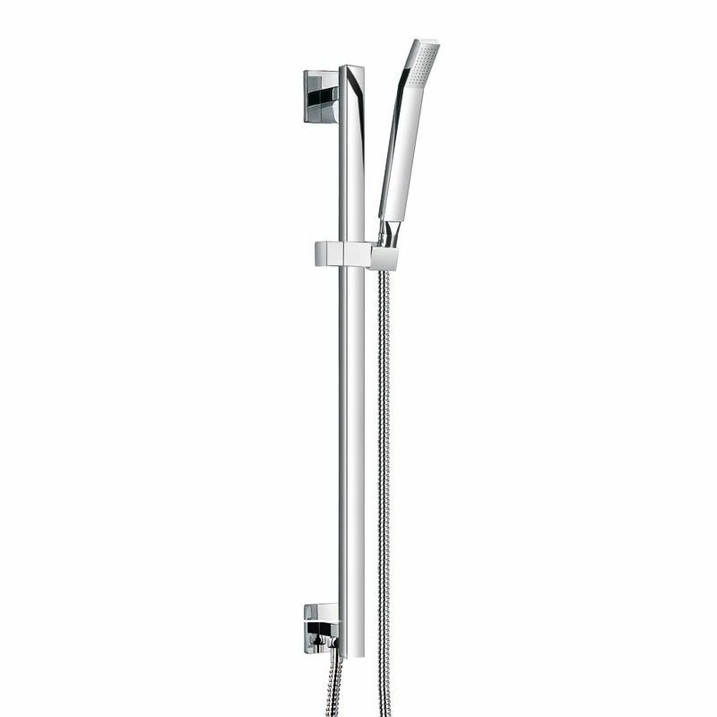 Set de douche complet en laiton finition chromé comprenant douchette, flexible pvc 150 cm et barre. Prise d’eau intégrée dans la barre. Pour solution de douche à encastrer.