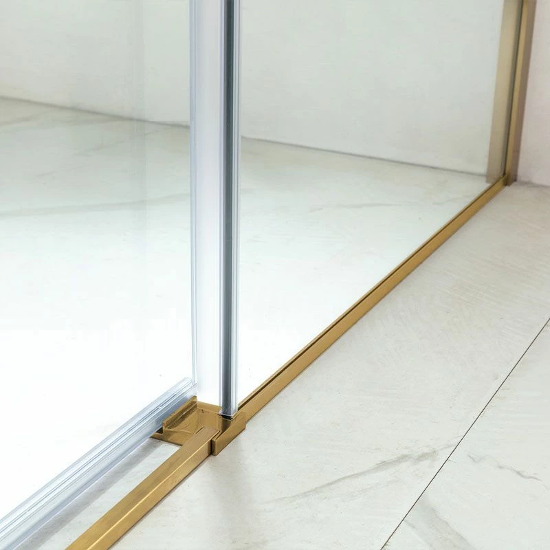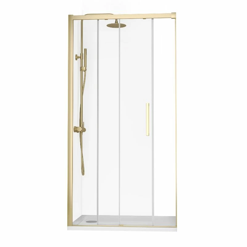 Ensemble complet, composé d’une porte de douche coulissante avec profilés dorés brossés Arena, d’un receveur en acrylique extra-plat Bora 100×80 cm et de la colonne de douche mitigeur Châtelet inox doré brossé. La porte est fabriquée en verre trempé Securit de 6mm, sa poignée et ses profilés sont en aluminium. Modèle réversible gauche ou droite. Extensibilité de 0 à 10mm. Hauteur : 195cm.