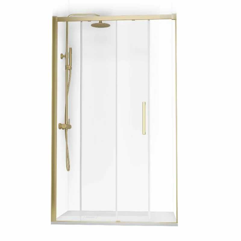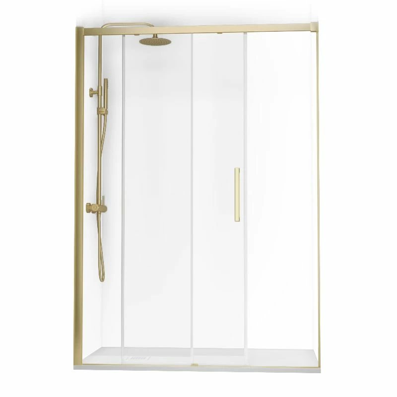 Ensemble complet, composé d’une porte de douche coulissante avec profilés dorés brossés Arena 2, d’un receveur blanc en Solid Surface Toscane et de la colonne de douche mitigeur Châtelet inox doré brossé. La porte est constituée d’une paroi fixe et d’une paroi coulissante. Fabriquée en verre trempé Securit de 6mm, sa poignée et ses profilés sont en aluminium. Modèle réversible gauche ou droite. Extensibilité de 0 à 10mm. Hauteur : 195cm.