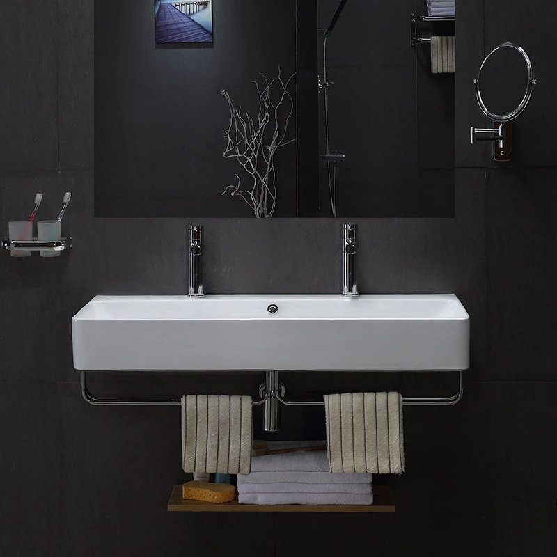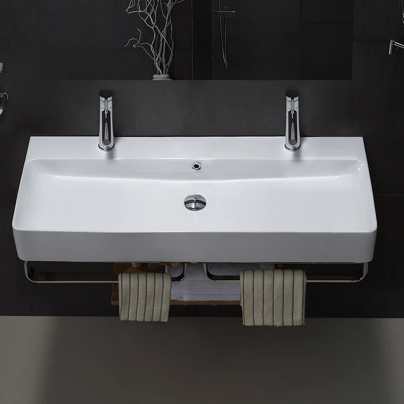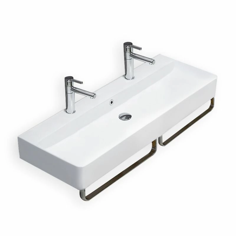 Avec ce lavabo double suspendu, vous êtes sûr de faire le bon choix. Son double percement de robinetterie et sa grande dimension est un réel avantage et se révèle très pratique au quotidien. Ce lavabo épuré et raffiné s’intégrera parfaitement dans votre pièce d’eau. Le fait d’être suspendu libère de l’espace et donne un côté aérien et minimaliste très contemporain. Son porte-serviettes intégré, en cuivre chromé, sera toujours à porter de mains et vous fera gagner de la place. Vous pouvez compléter ce lavabo avec une bonde clic-clac étant donné qu’il est équipé d’un trop-plein.