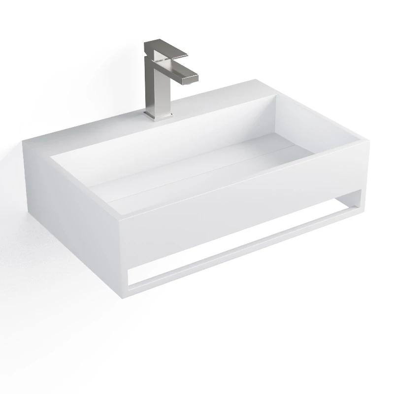Lavabo suspendu Minéral en résine, Solid Surface, blanc mat. Avec plage de robinetterie et sans percement (la résine se perce facilement à l’aide d’une scie cloche). Vidage caché “à lame”. Sans trop plein, il faudra l’associer avec une bonde à écoulement libre en option. Porte-serviettes directement découpé dans la masse. Dimensions 60 x 40 x 17 cm