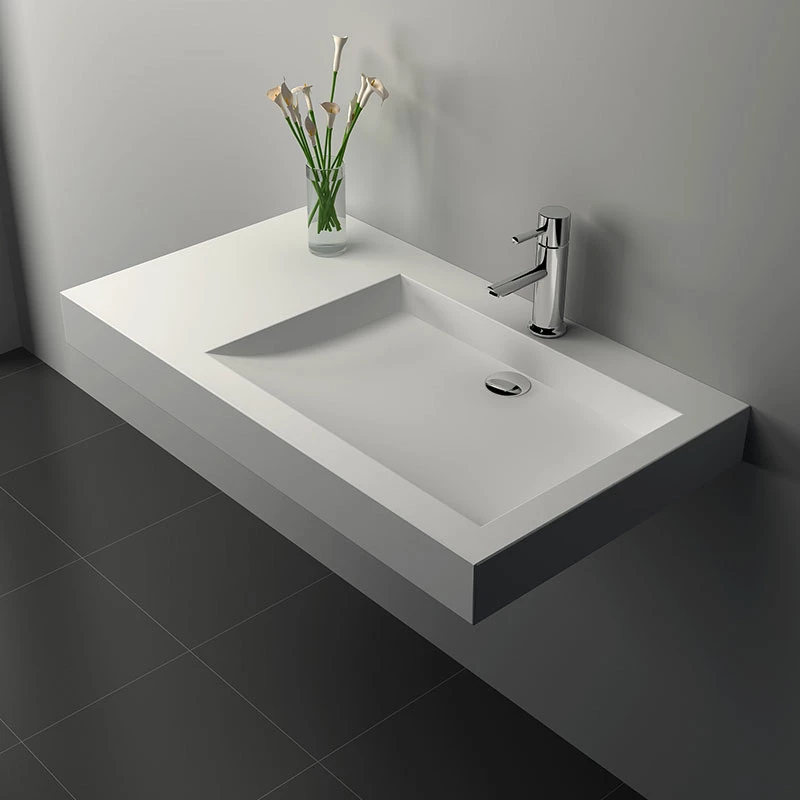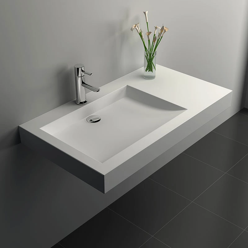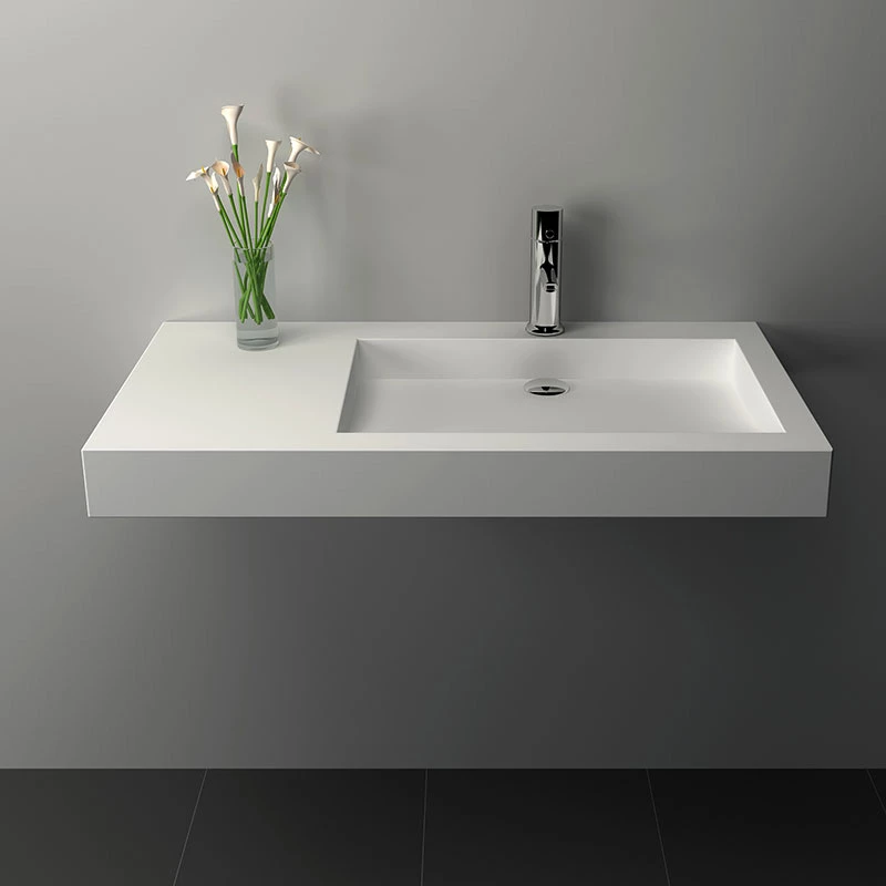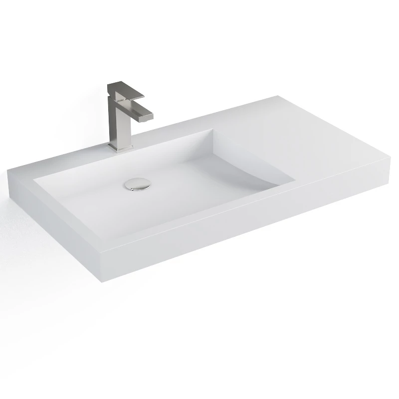 Lavabo suspendu gauche ou droite, en résine Minerale, Solid Surface, blanc mat. Sa large plage sur le côté permet de poser vos accessoires. Lavabo avec plage de robinetterie. Sans percement (la résine se perce facilement à l’aide d’une scie cloche). Sans trop plein, il faudra l’associer avec une bonde à clapet fixe en option. Dimensions : 81 x 45,5 x 7,5 cm