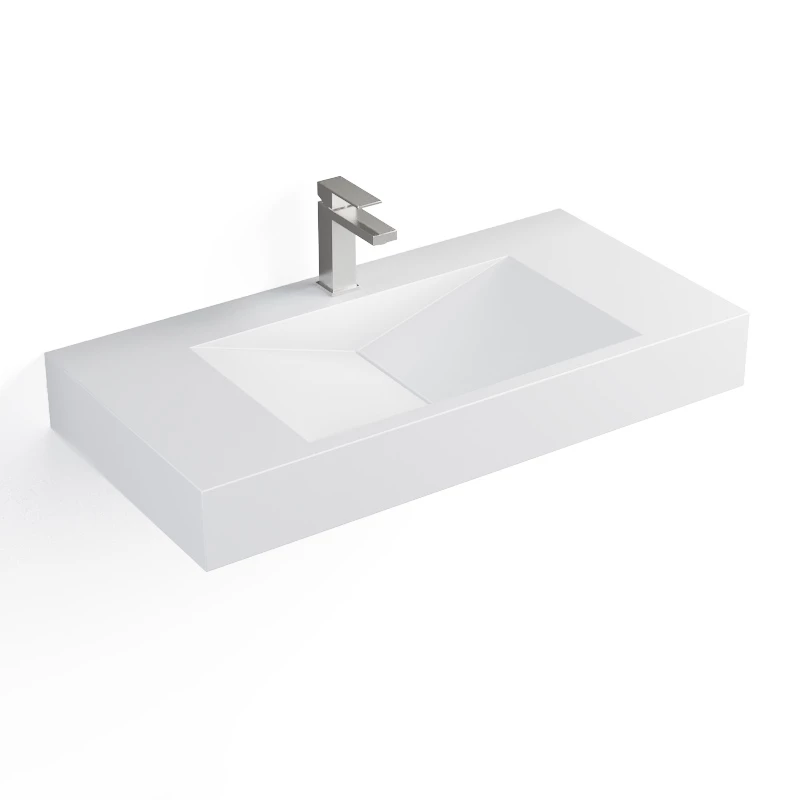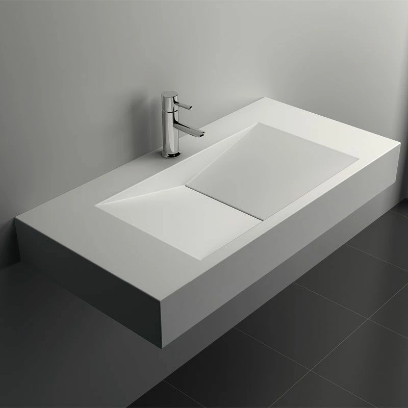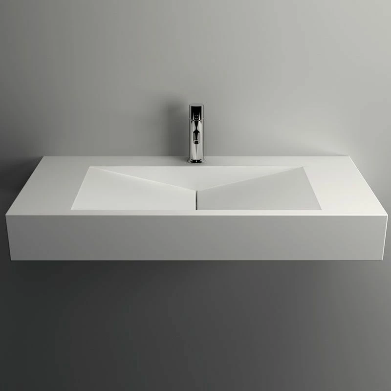 Ce plan vasque en composite minéral blanc mat, Solid Surface, propose un design très minimaliste. Ses lignes épurées finissent par se rejoindre au niveau du siphon, qui caché, apporte une réelle innovation esthétique. Sans percement de robinetterie.