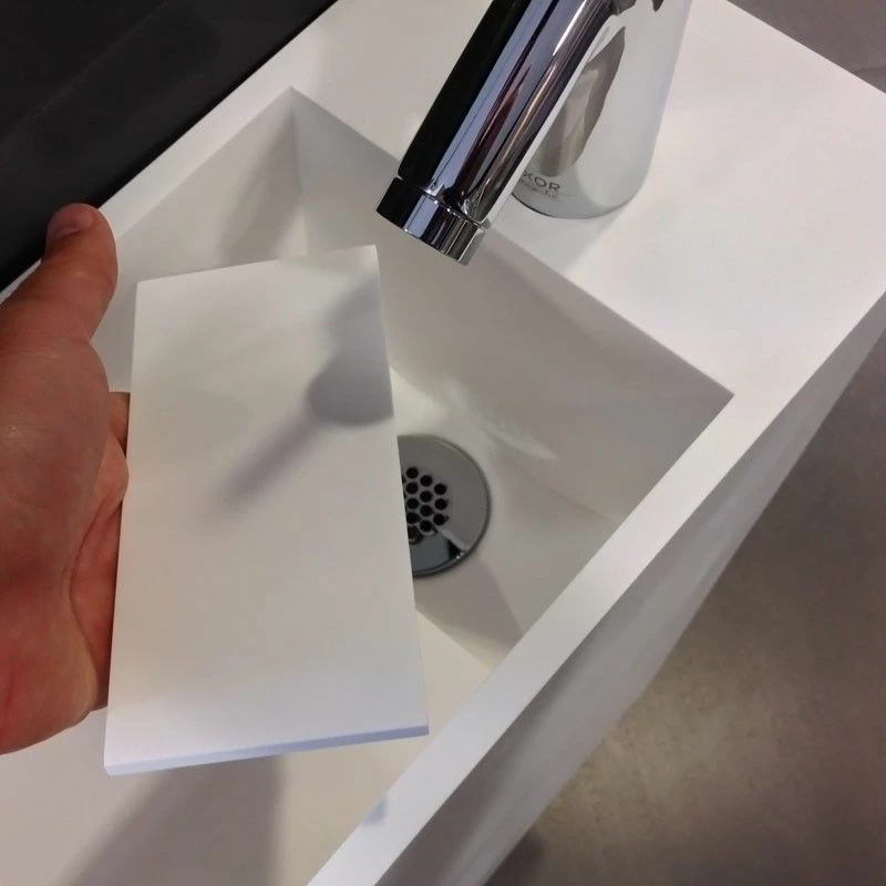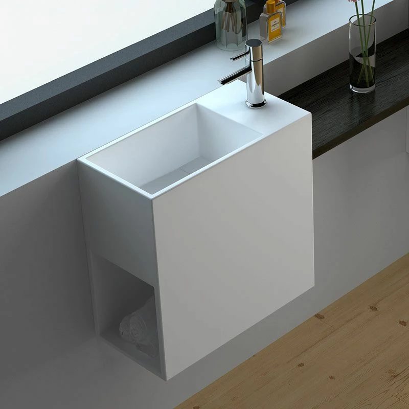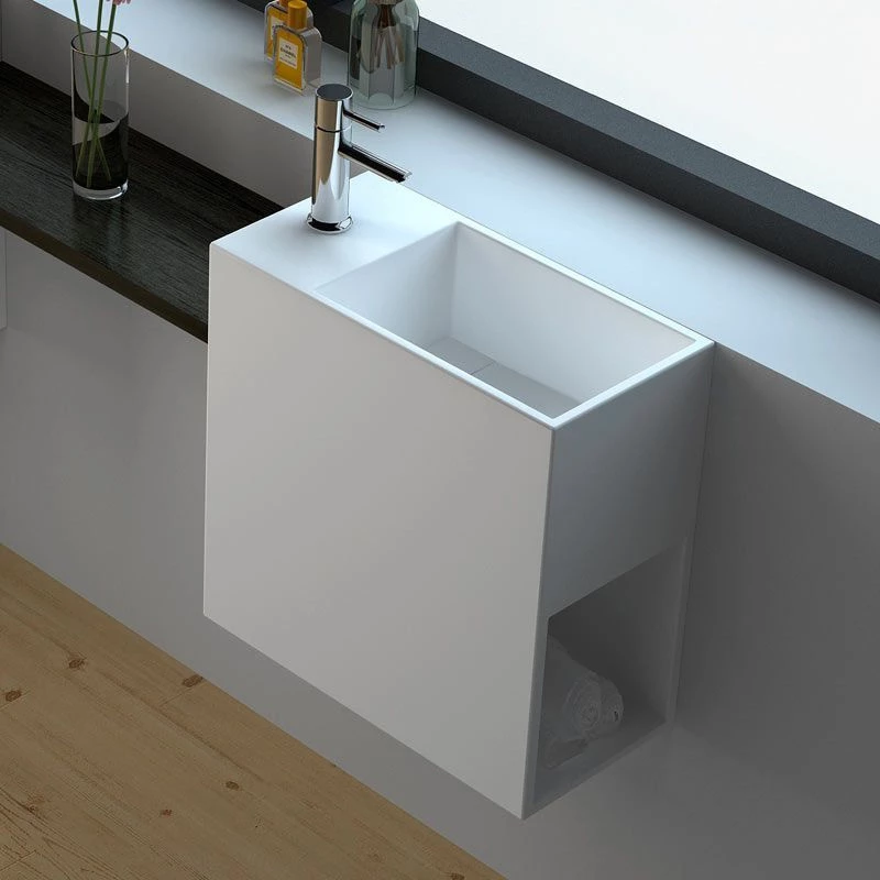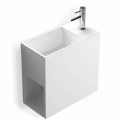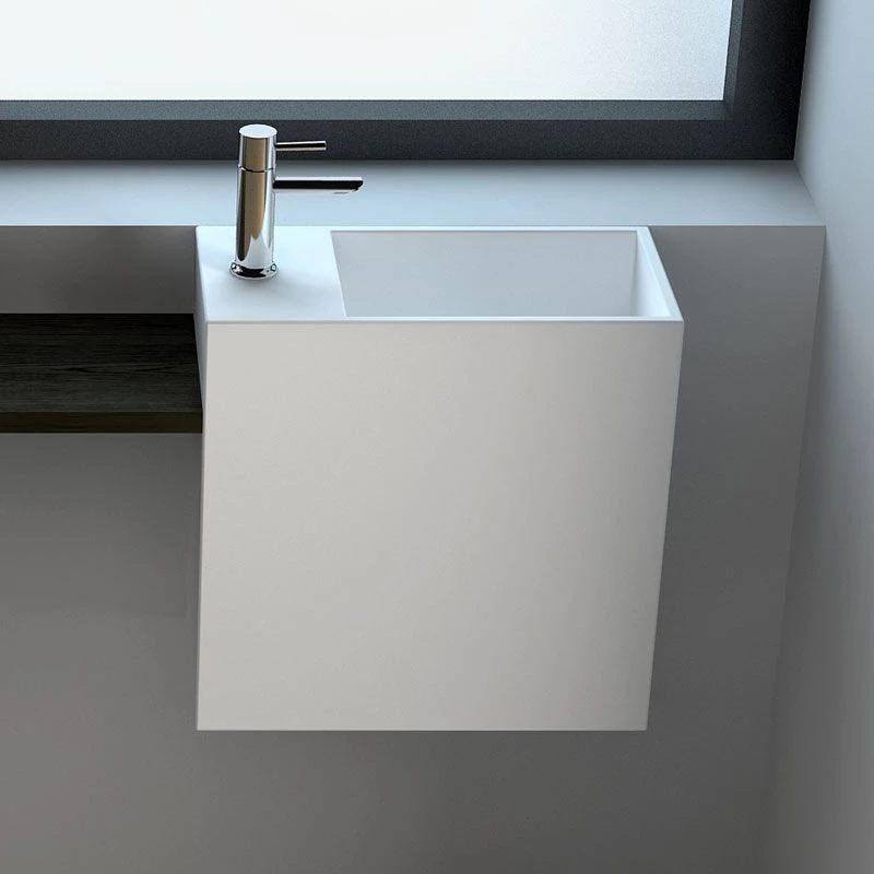Lavabo suspendu Minéral en résine, Solid Surface, blanc mat. Avec plage de robinetterie et sans percement (la résine se perce facilement à l’aide d’une scie cloche). Sans trop-plein. Espace de rangement inclus. Vidage caché “à lame” bonde à écoulement libre en option. Disponible en version droite ou gauche.