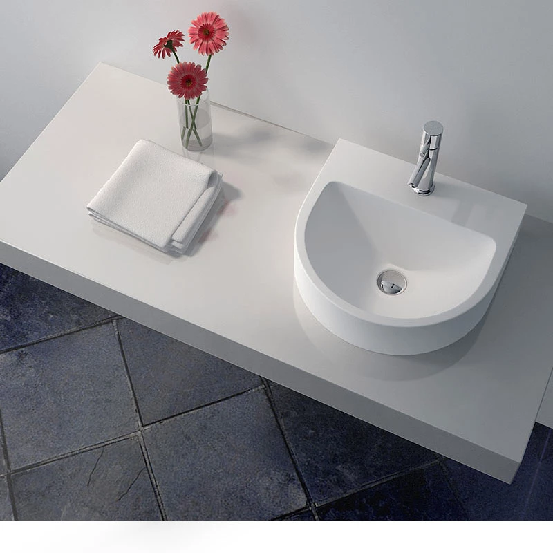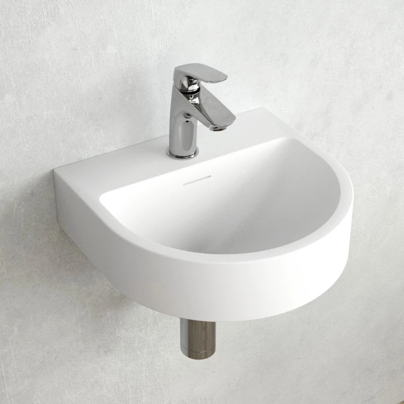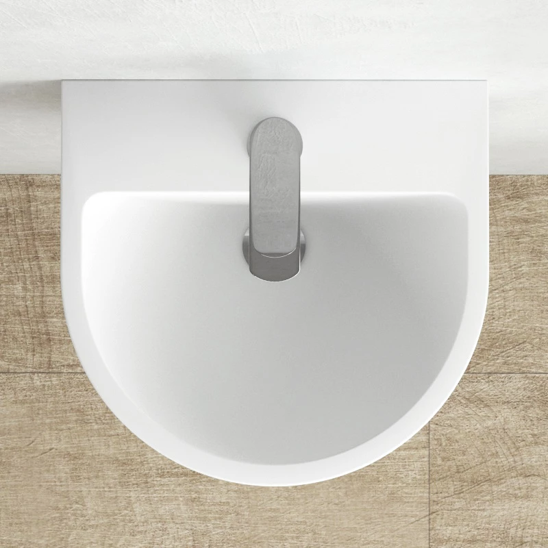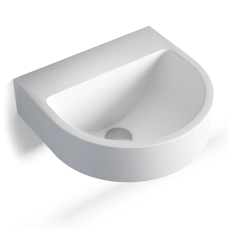 Lave-mains suspendu, Minéral en résine, Solid Surface, blanc mat. Sa plage de robinetterie est sans percement (la résine se perce facilement à l’aide d’une scie cloche). Sans trop plein, il faudra l’associer avec une bonde à clapet fixe en option Peut être suspendu ou semi-encastré. Dimensions : 38 x 36 x 20 cm