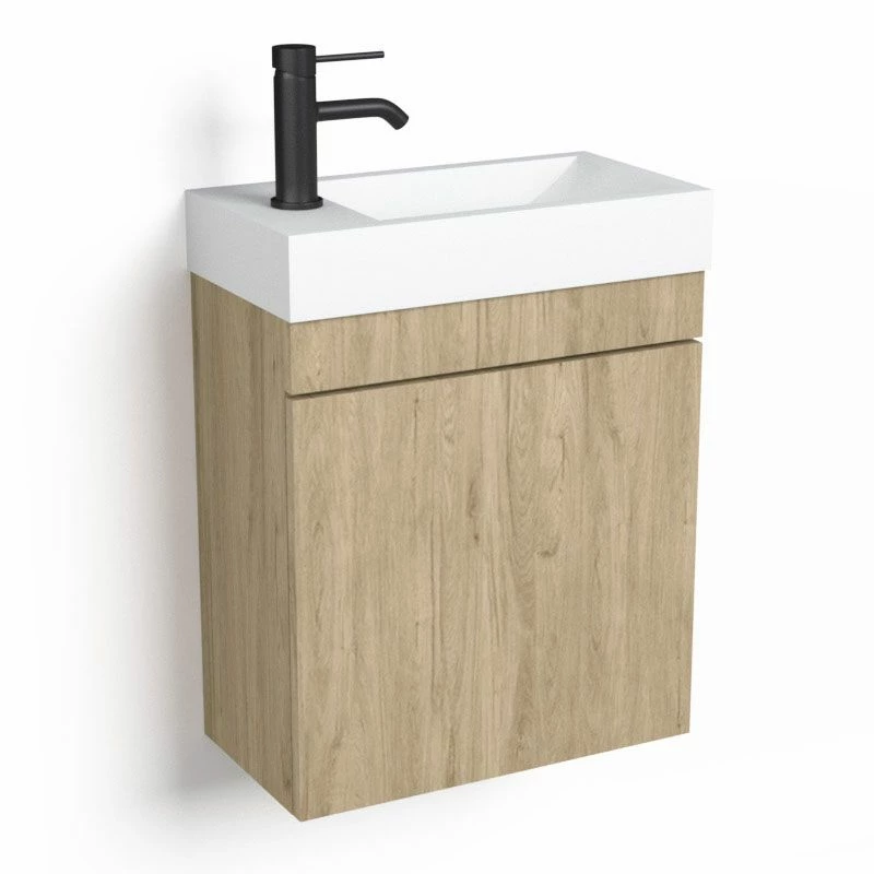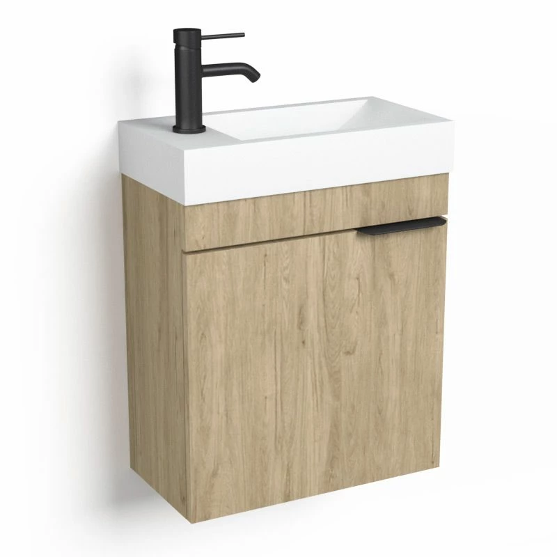 Le meuble lave-main suspendu finition chêne Denver, Alma est idéal pour les espaces réduits grâce à sa faible profondeur. Il dispose d’un plan vasque réversible en résine minérale blanc mat et est équipé d’une porte avec système de fermeture amortie, à compléter avec la poignée de votre choix (non incluse). Robinetterie et siphon non fournis. Vasque avec percement monotrou, sans trop-plein, à compléter avec une bonde à clapet fixe. Dimensions : l.44,5xP.23,7xH.54,3 cm.
