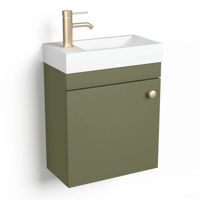 Le meuble lave-main suspendu finition vert olive, Alma est idéal pour les espaces réduits grâce à sa faible profondeur. Il dispose d’un plan vasque réversible en résine minérale blanc mat et est équipé d’une porte avec système de fermeture amortie, à compléter avec la poignée de votre choix (non incluse). Robinetterie et siphon non fournis. Vasque avec percement monotrou, sans trop-plein, à compléter avec une bonde à clapet fixe. Dimensions : l.44,5xP.23,7xH.54,3 cm.