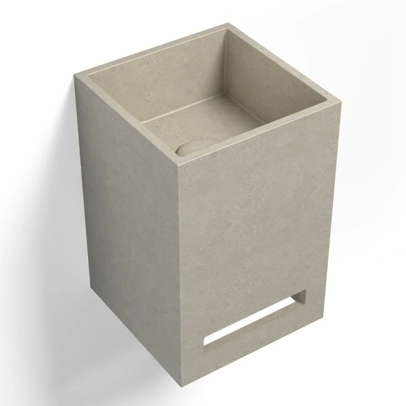 Lave-mains suspendu en béton, coloris terrazzo beige, T12. Ce lave-mains design et de qualité avec porte-serviette intégré donnera une touche moderne et urbaine à votre pièce. Traitement hydrofuge et oléofuge. Sans trop-plein. Bonde à écoulement libre assortie en option.