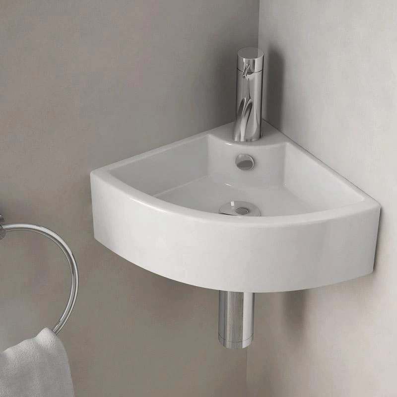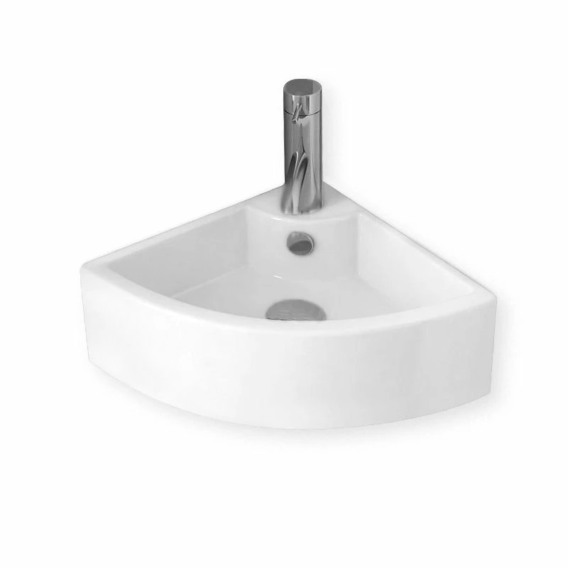 Lave-mains suspendu réalisé en céramique blanche antibactérienne, avec plage de robinetterie et trop-plein. Installation en angle.Largeur : 44.5 cm – profondeur : 31 cm – hauteur : 12.5 cm.