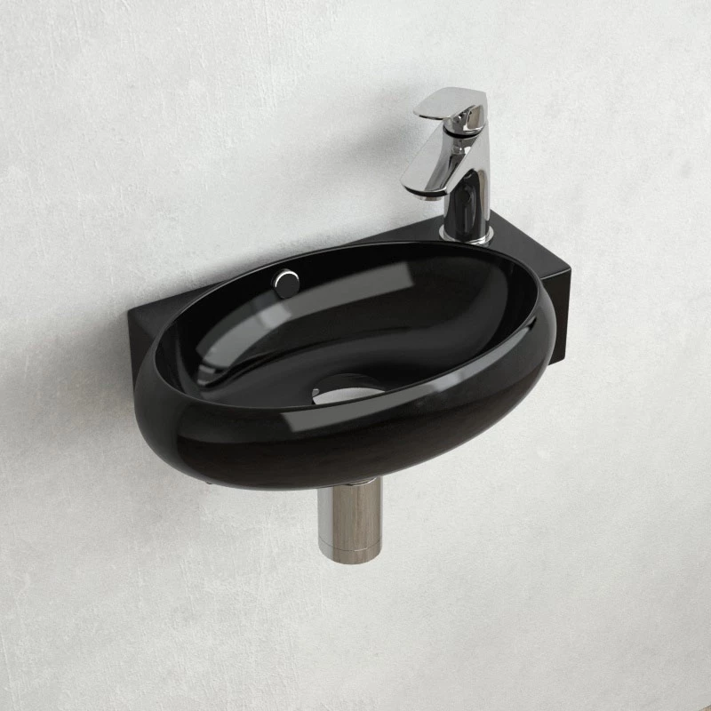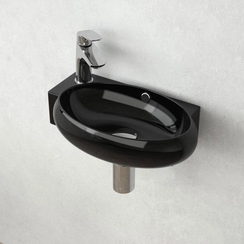 Ce lave-mains en céramique noire s’intégrera harmonieusement dans tous les types de salle de bains ou toilettes. Existe avec vasque côté gauche ou droite. Avec trop-plein et percement de robinetterie.