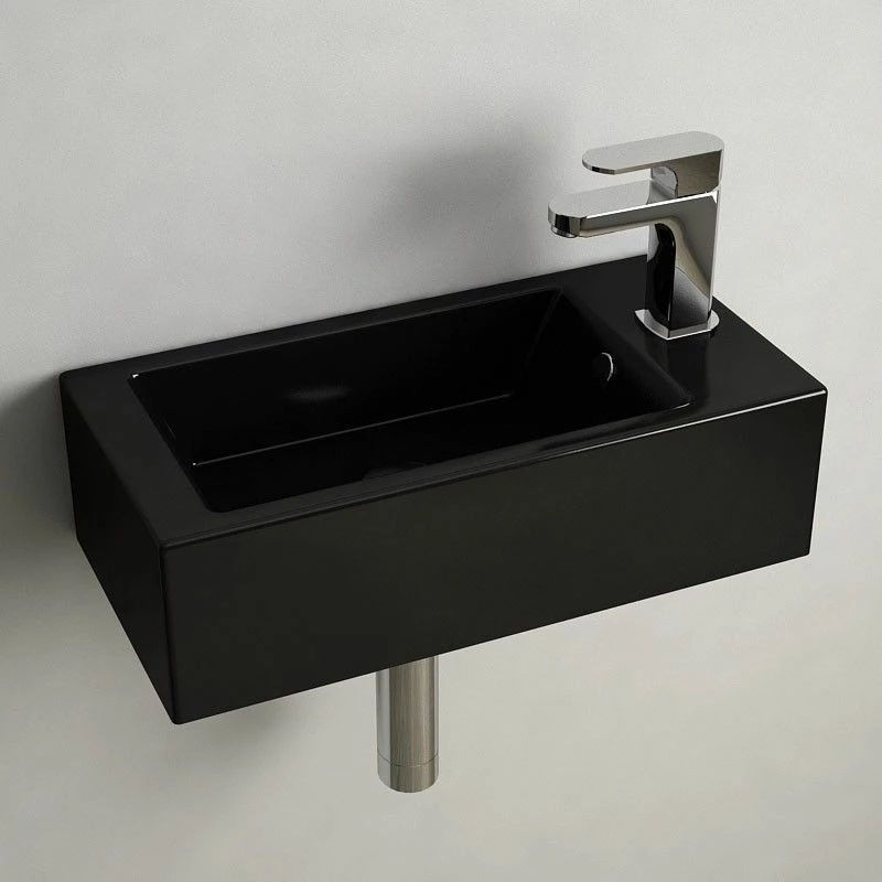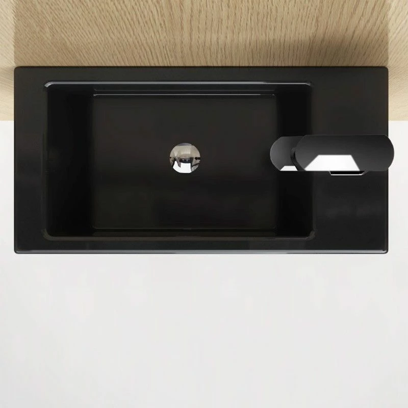 Lave-mains suspendu en céramique noire. Fixations murales et trop-plein avec cache chromé inclus. Idéal pour les petits espaces. Plage de robinetterie avec percement monotrou. Prévoir un robinet lavabo à poser. La céramique noire peut comporter des micro-rayures.