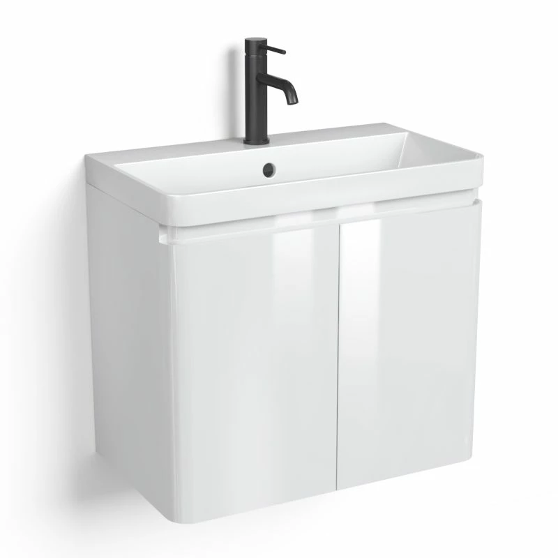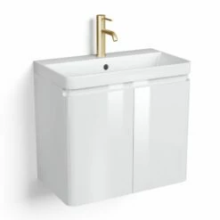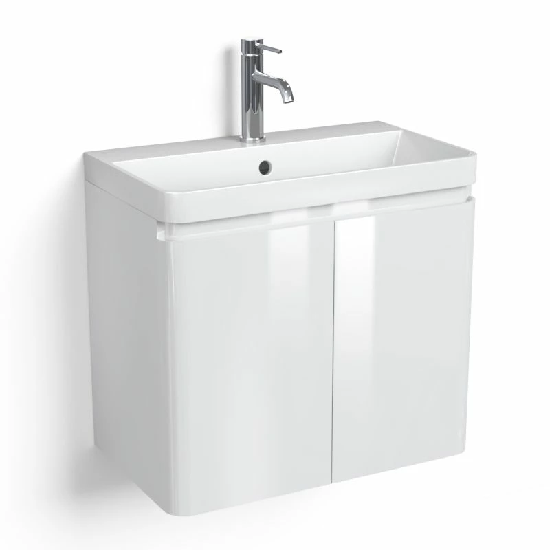 Meuble de salle de bain suspendu avec plan-vasque en céramique, blanc, Eze et robinetterie Châtelet. Ce meuble vasque de 60 cm est équipé de deux portes battantes avec fermetures amorties SoftClose. Sa taille est idéale pour les petites pièces d’eau et il offre des capacités de rangement de salle de bain optimum. Plan-vasque percé monotrou avec trop-plein inclus.