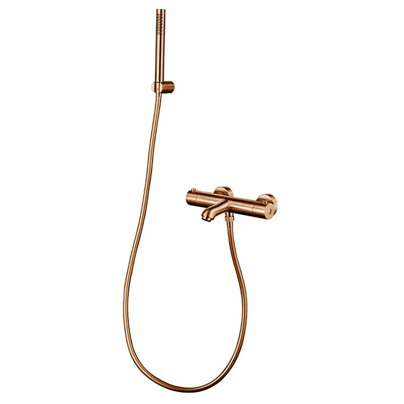 Robinet mitigeur thermostatique baignoire mural doré rose brossé, Châtelet. Ce robinet de baignoire au design minimaliste allie finesse et lignes intemporelles pour s’intégrer dans une salle de bains contemporaine ou classique avec ses lignes courbes élégantes. La finition doré rose brossé apporte, de par son aspect mat, une touche de raffinement supplémentaire à ce modèle de robinetterie. Livré avec une douchette tube, son flexible PVC et son support. Garantie 5 ans.