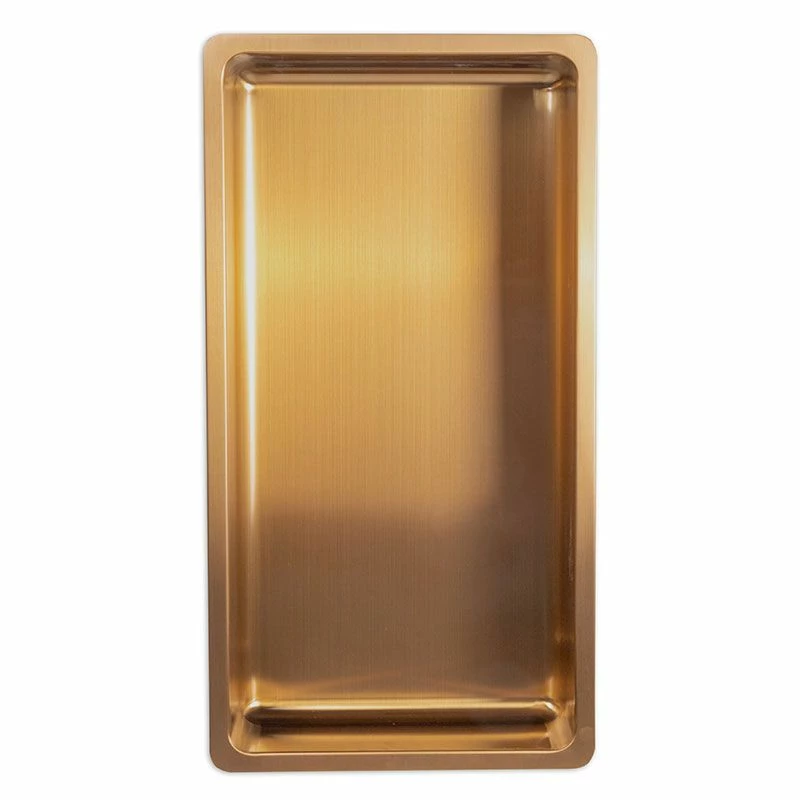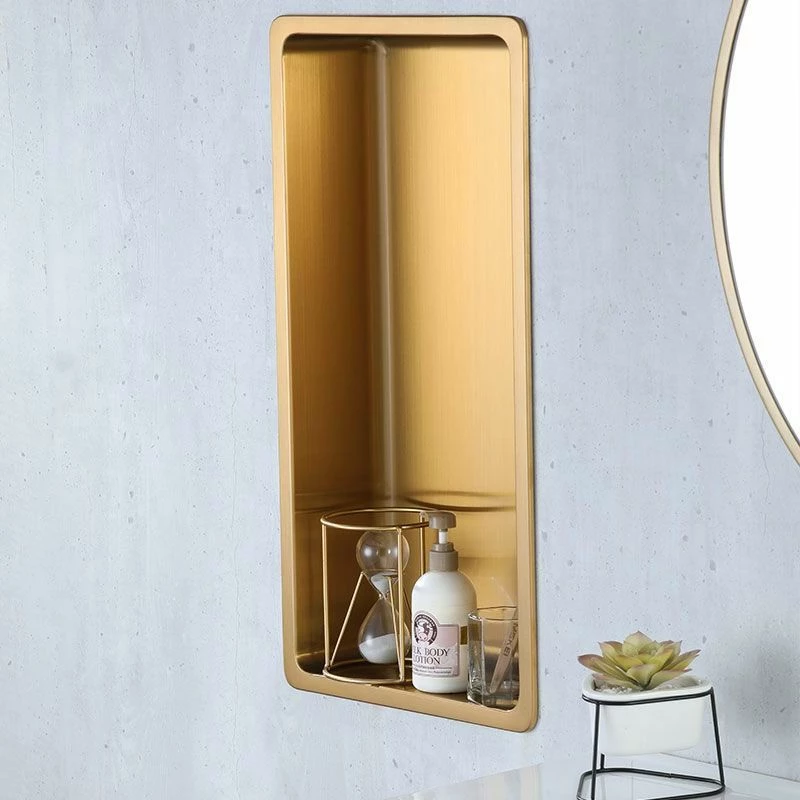 Niche murale encastrée en inox doré brossé, 60 x 30 cm. Cette niche, pour pose verticale ou horizontale, est idéale pour optimiser votre espace tout en ajoutant une touche hyper design à votre salle de bain. Elle apportera une note de modernité et d’élégance à votre espace. Réalisée en acier inoxydable, elle possède une grande résistance à la corrosion et à l’humidité.