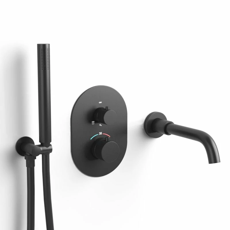 Composition bain/douche mitigeur encastré noir mat, Châtelet III. Ce pack contient un set de douche complet : une douchette à main, un flexible et un support avec prise d’eau, un mitigeur avec inverseur 3 sorties et un bec de bain. Flexible en PVC. Garantie 5 ans. Découvrez l’ensemble de la gamme Châtelet III pour affirmer le design de votre salle de bains.