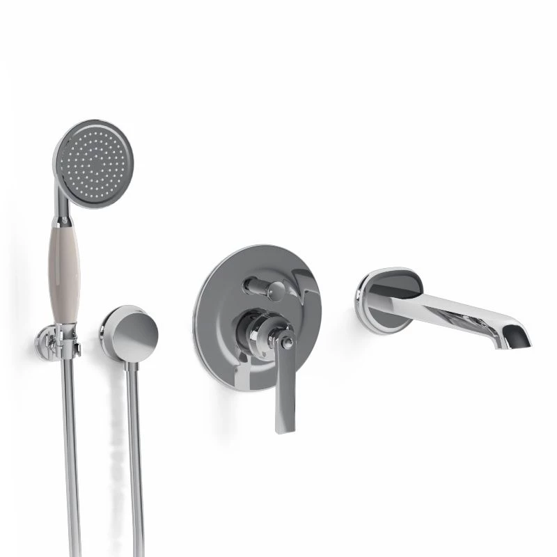 Composition bain/douche Liberty en laiton finition chromée comprenant : un bec de bain chromé, un set de douche complet et un robinet mitigeur avec inverseur 2 sorties. Corps d’encastrement inclus. Cartouche mitigeur avec disque céramique Sedal.