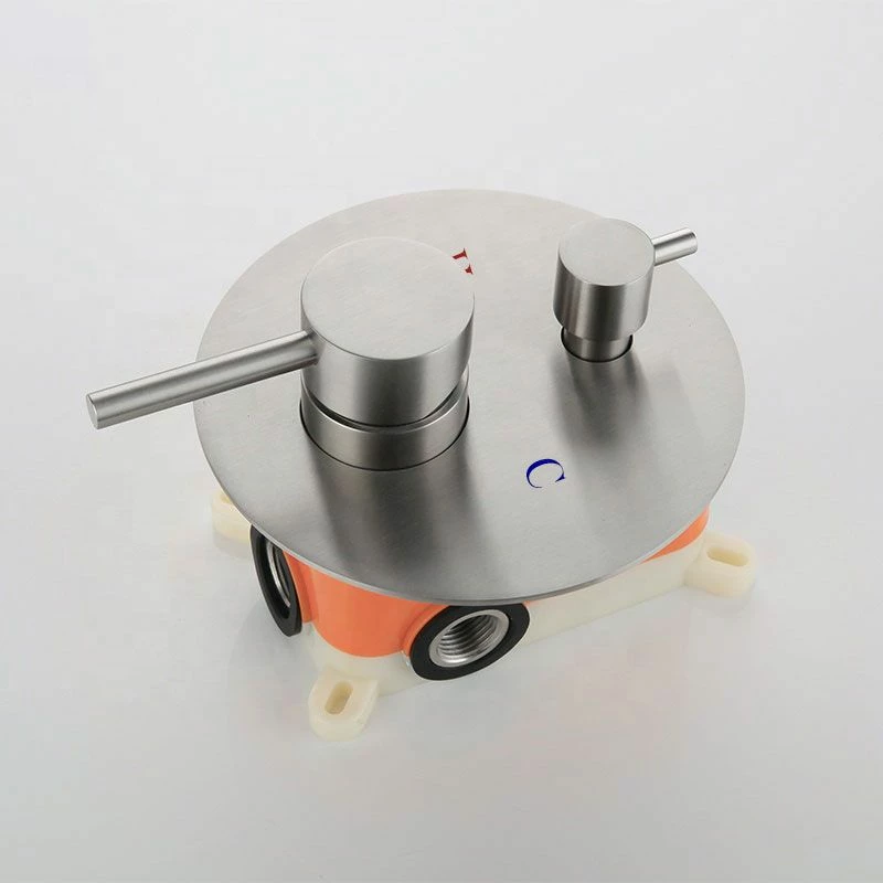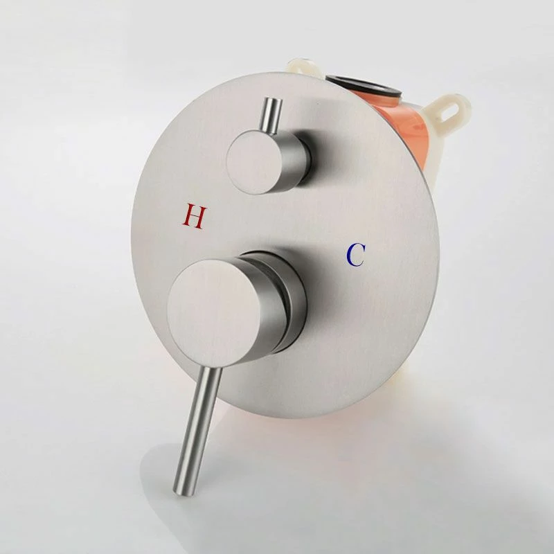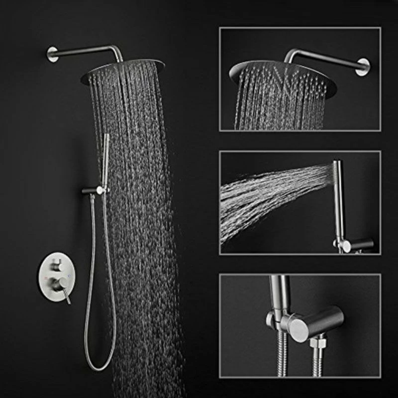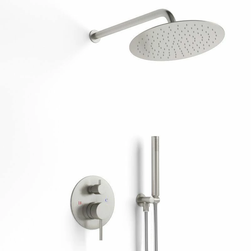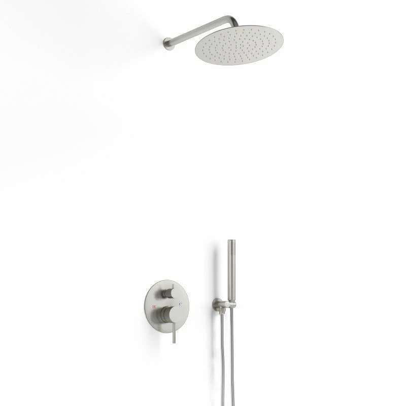 Composition de douche mitigeur encastré en inox brossé, Châtelet. Ce pack contient une douche de tête Slim, un set de douche complet : douchette à main, flexible et crochet avec prise d’eau et mitigeur avec inverseur 2 sorties. Flexible en PVC. Garantie 5 ans. Découvrez l’ensemble de la gamme Châtelet pour affirmer le design de votre salle de bains Corps d’encastrement inclus.