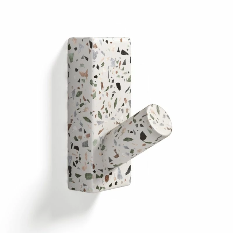 Patère en béton, finition terrazzo blanc, T16. Avec sa forme clou, cette patère apportera une touche contemporaine et authentique à votre pièce d’eau. Disponible également en d’autres finitions.