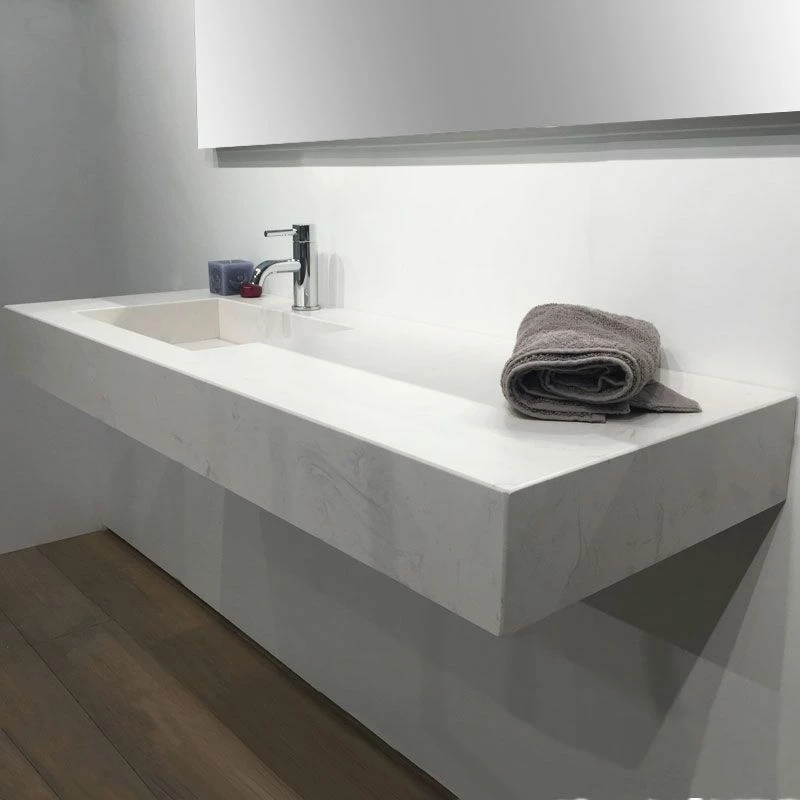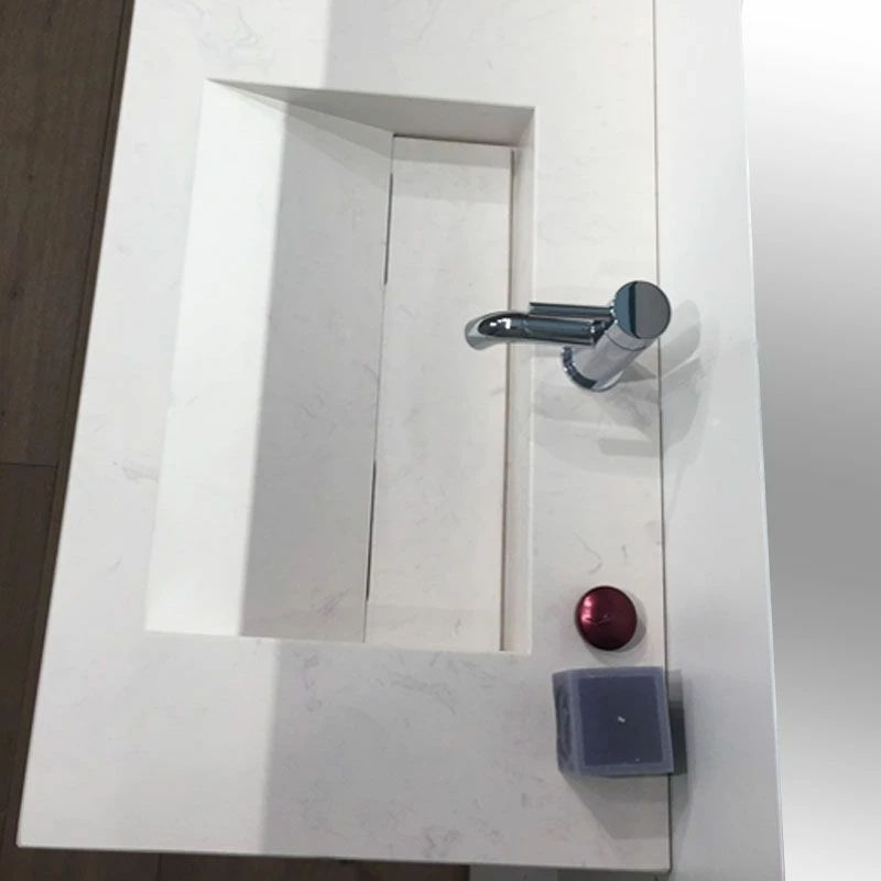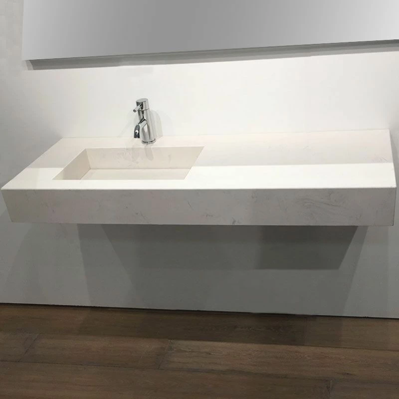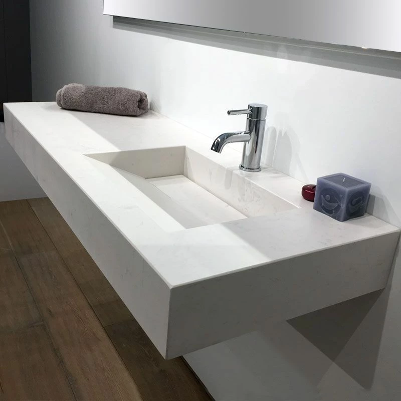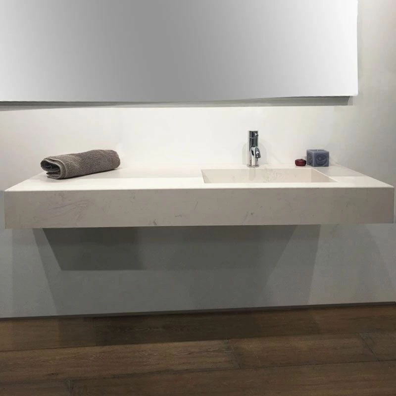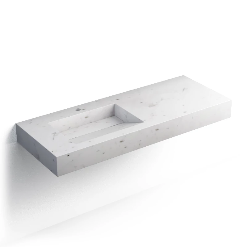 Ce plan vasque salle de bain suspendu réalisé en pierre reconstituée Calacatta apportera une touche d’authenticité dans votre salle de bain. Ce dernier dispose d’un vidage caché “à lame”. Sans trop-plein, il devra être associé à une bonde à grille vendue séparément. La vasque est décalée offrant ainsi une large plage permettant de poser des accessoires. Plage de robinetterie de 10 cm percée. Supports métal de fixation vendus séparément. Nous contacter pour plan vasque sans percement.