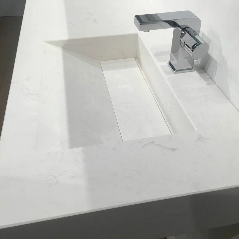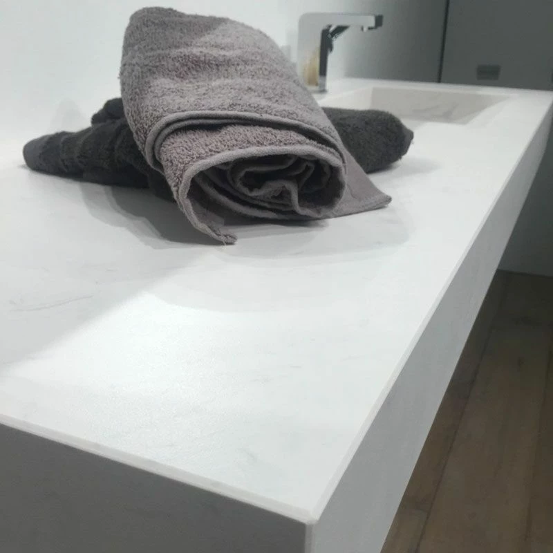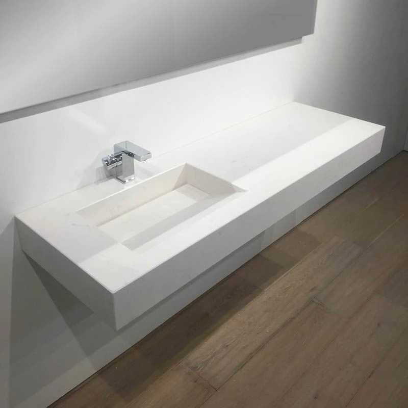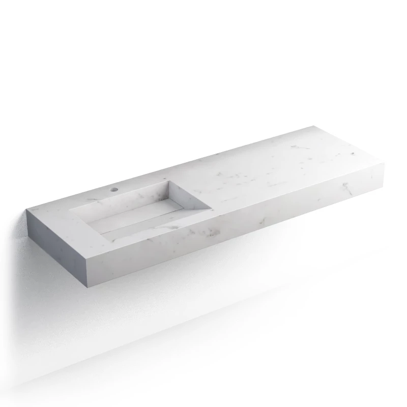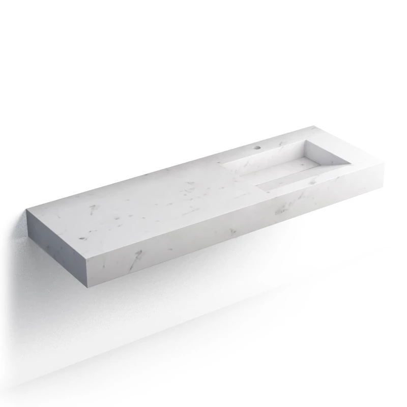 Plan vasque salle de bain suspendu réalisé en pierre reconstituée Calacatta. Ce dernier dispose d’un vidage caché “à lame”. Sans trop-plein, il devra être associé à une bonde à grille vendue séparément. La vasque est décalée offrant ainsi une large plage permettant de poser des accessoires. Sa plage de robinetterie, d’une profondeur de 10 cm est déjà percée. Supports métal de fixation vendus séparément.