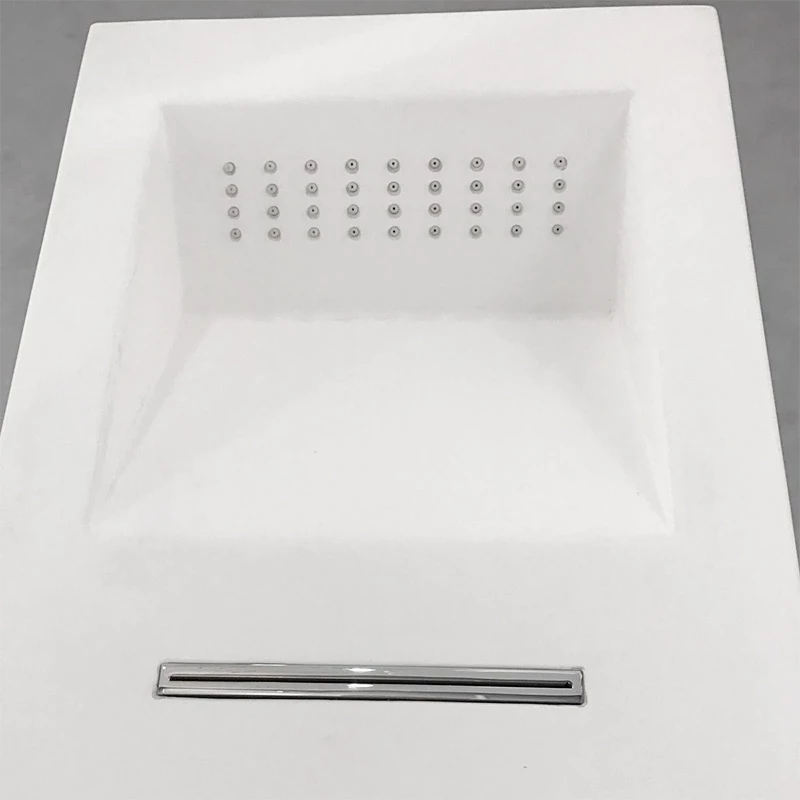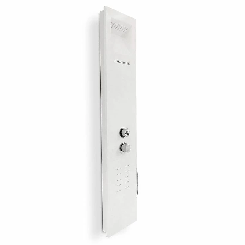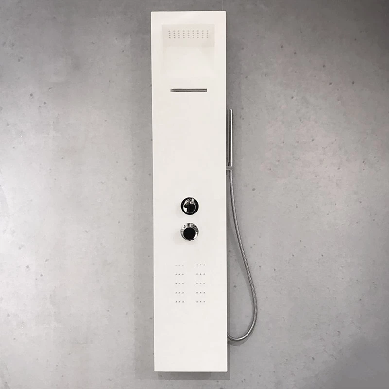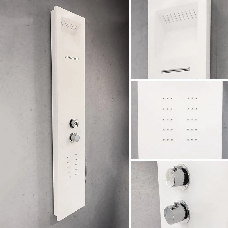 Ce panneau de douche, thermostatique, réalisé en Solid Surface, allie qualité et bien-être. La résine minérale, avec laquelle il est fabriqué, est facile d’entretien, résistante aux rayures, de plus ce matériau à la douceur du satin. Ses jets massants associés à sa cascade et à sa douche de tête vous offriront de véritable moments de détente. La douche de tête est totalement intégrée dans le panneau, accentuant le côté minimaliste du produit.