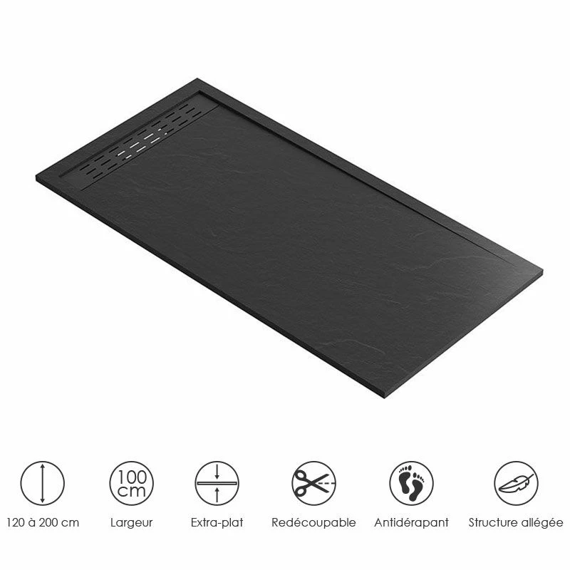 Receveur de douche noir en résine minérale, Jungle. Ce receveur extra-plat est pigmenté dans la masse. Sa surface est anti-bactérienne et anti-dérapante. Redécoupable, il épouse parfaitement les toutes les formes de mur. Grille noire rectangulaire design et bonde incluses. Garantie 3 ans.