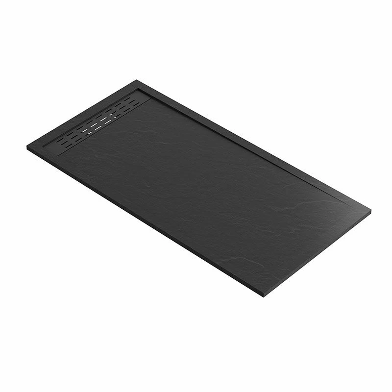 Receveur de douche noir en résine minérale, Jungle. Ce receveur extra-plat est pigmenté dans la masse. Sa surface est anti-bactérienne et anti-dérapante. Redécoupable, il épouse parfaitement les toutes les formes de mur. Grille noire rectangulaire design et bonde incluses. Garantie 3 ans.
