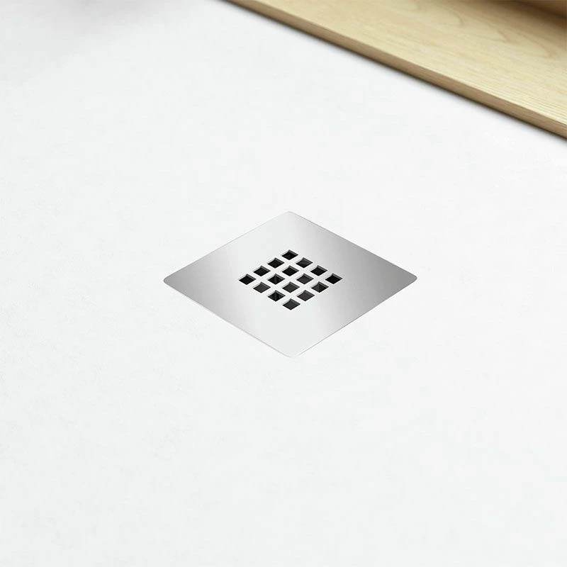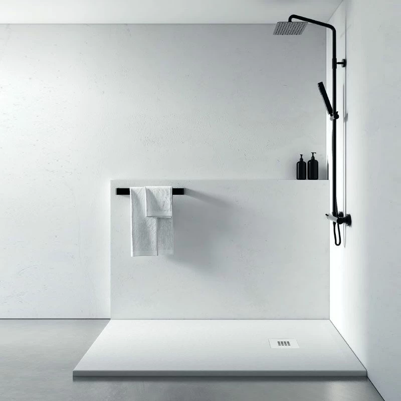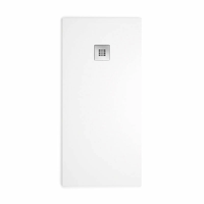 Receveur de douche blanc, France. La surface texturée de ce receveur en résine minérale extra-plat est antidérapante, antibactérienne et résistante aux UV. Redécoupable, il est idéal pour les formes de mur particulières. Grille inox design carré et bonde incluses. Garantie 2 ans.